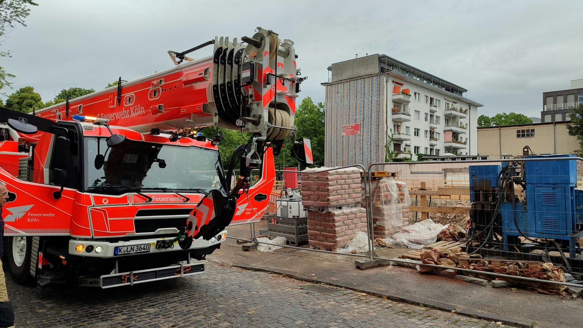 Blick auf die Baustelle am Morgen: Die Feuerwehr ist noch vor Ort, die Bombe wird gerade abtransportiert.