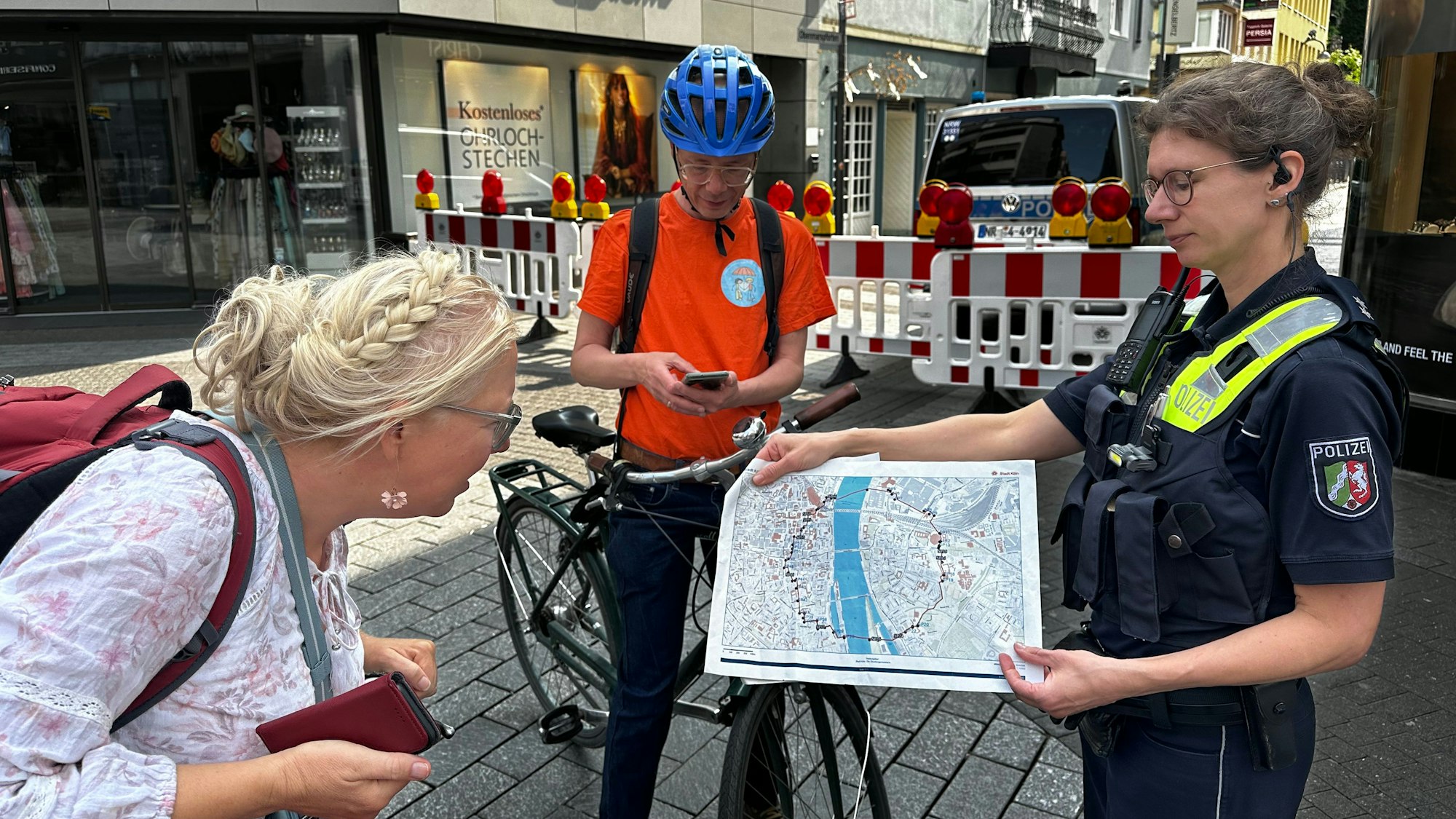 Wo darf man jetzt noch hin? Eine Polizistin zeigt auf der Hohe Straße das Sperrgebiet