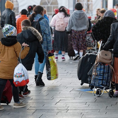 Eine Gruppe von Geflüchteten aus der Ukraine mit Haustieren.