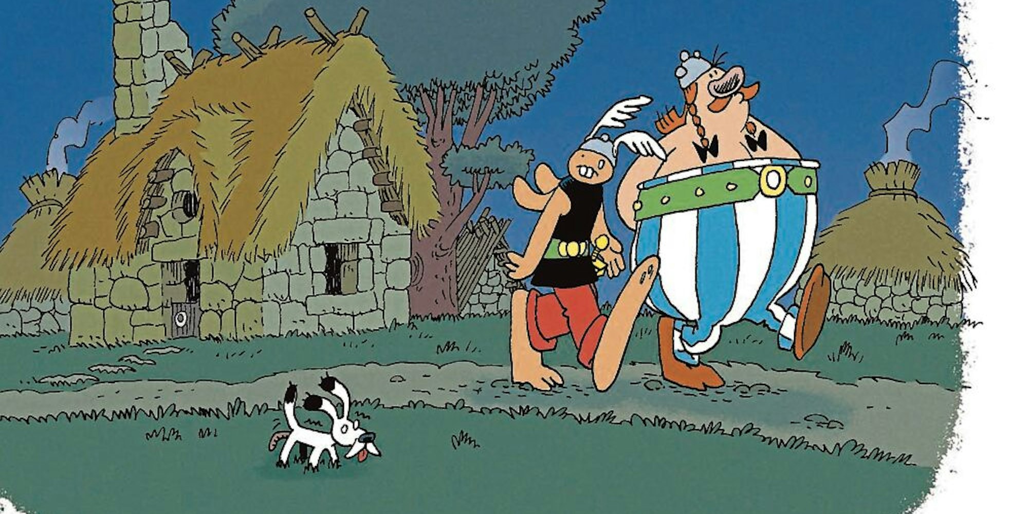 Herr Hase alias Asterix, Obelix und Hund Idefix spazieren durch ihr Dorf