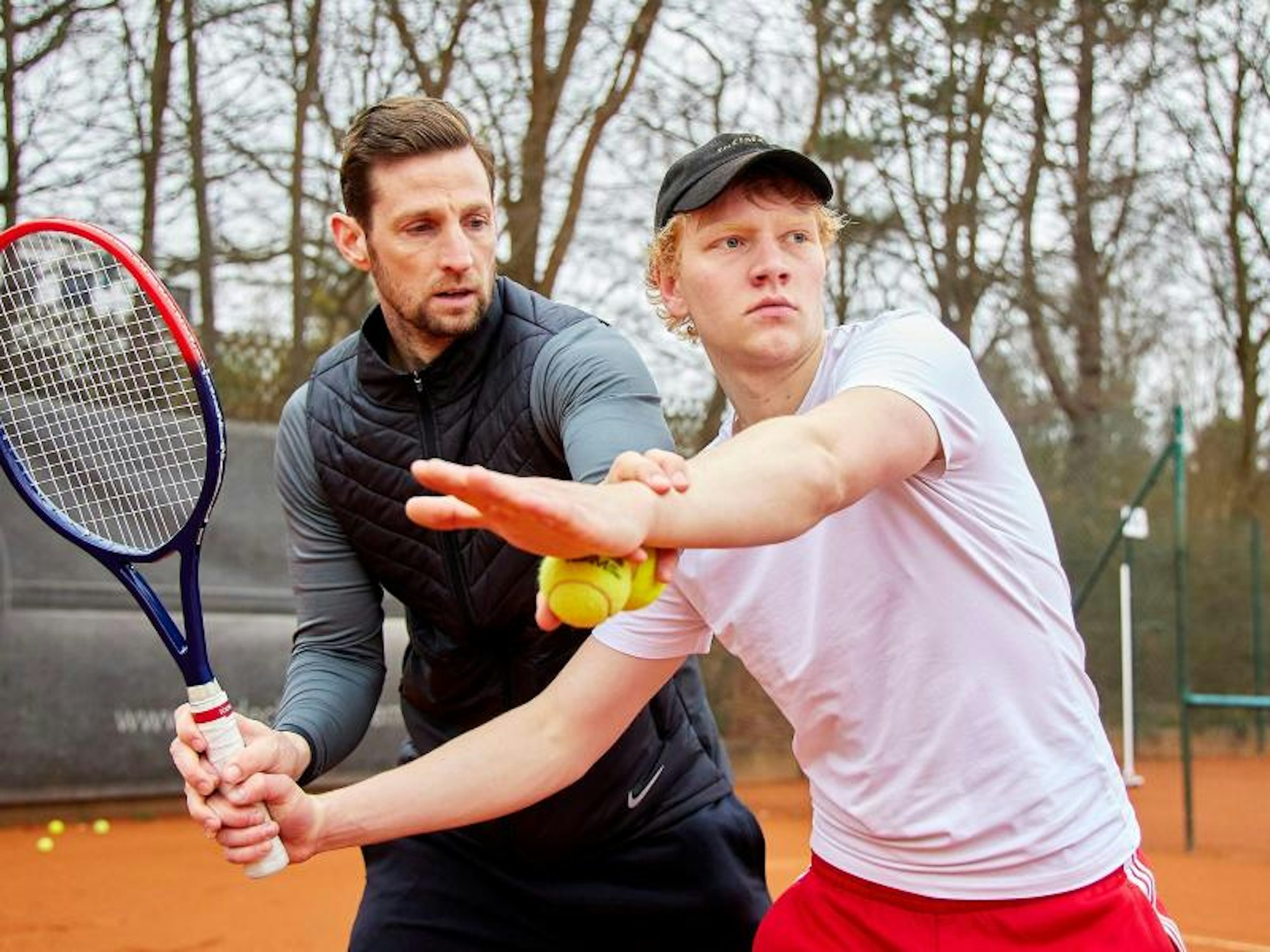Bruno Alexander (r.) trainiert für seine Rolle als junger Boris Becker.