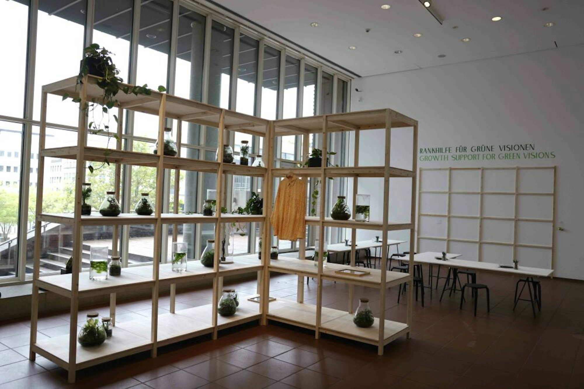 Ein Regal mit Glasgärten steht im Eingang.