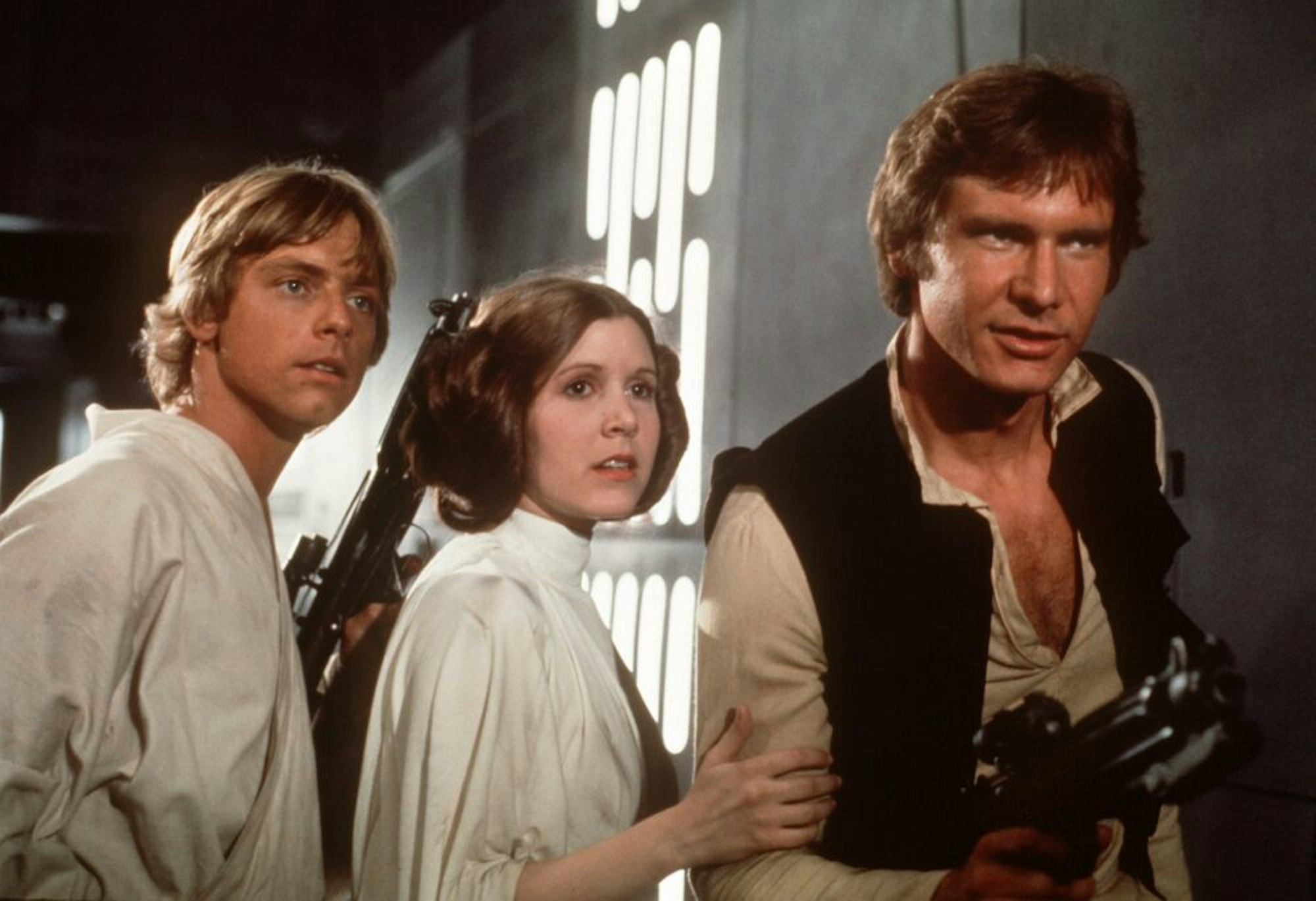 Harrison Ford als Han Solo mit Carrie Fisher und Mark Hamill