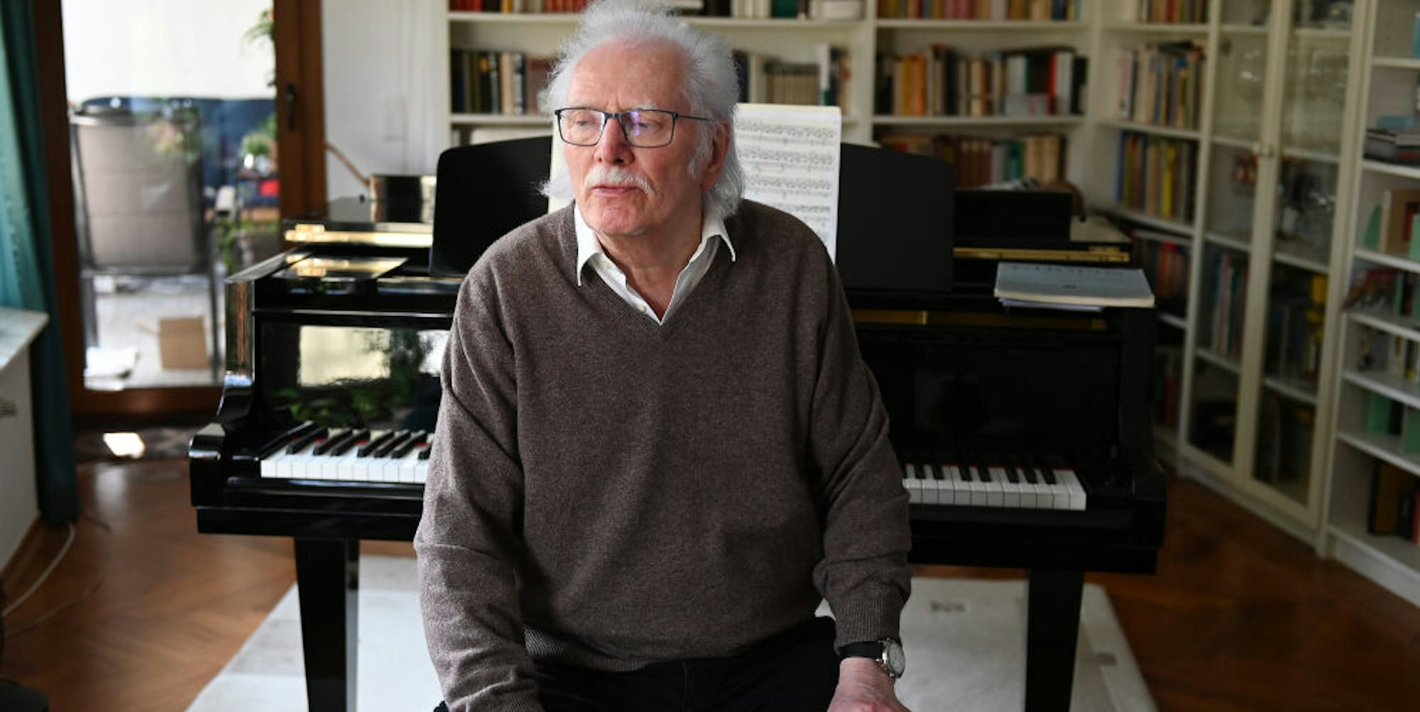Fühlt sich wohl mit dem Flügel im Rücken: der Komponist York Höller in seiner Kölner Wohnung.