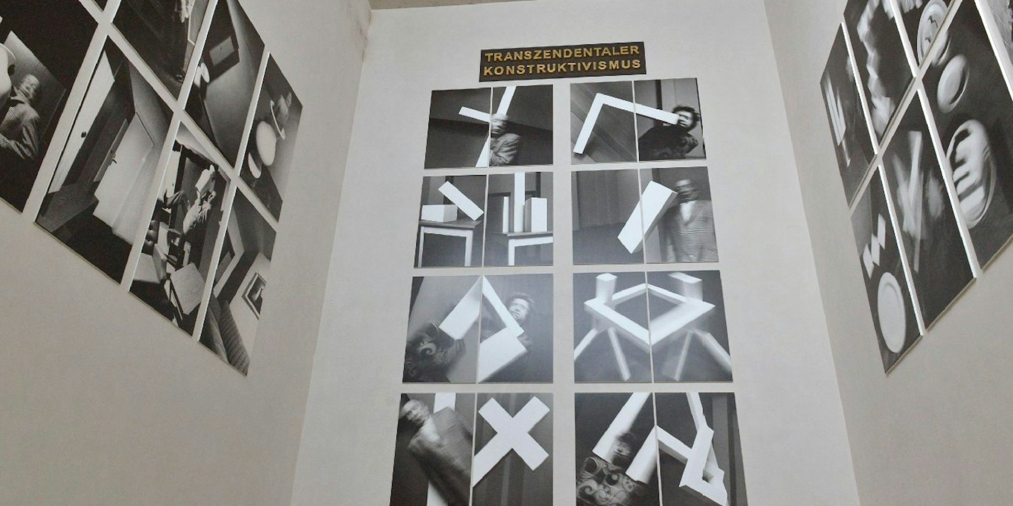 Erst ganz oben, im Südturm, löst sich die Klammer der düsteren Themen. Hier inszeniert Anna Blume jene Fotoarbeiten, die sie mit ihrem 2011 gestorbenen Ehemann Bernhard Johannes schuf, fast wie einen Flügelaltar. In diesen ver-rückten Szenen laufen Dinge Amok: Vasen geraten in Ekstase, geometrische Formen krachen, von Geisterhand beschleunigt, in verdutzte Gesichter. Die Welt ist aus den Fugen.