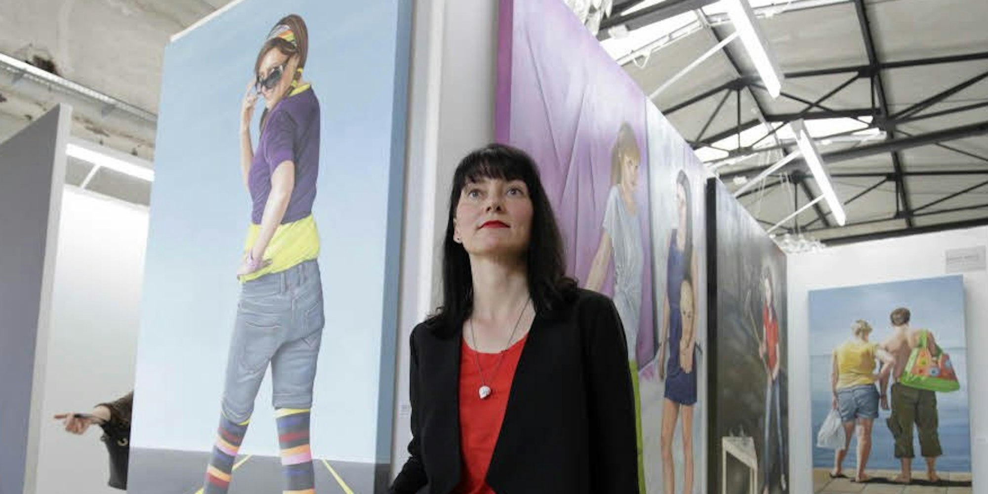 Malerin Kerstin Arnold mit ihren Werken in der Sonderschau „Faktor X“. (Foto: Brill)