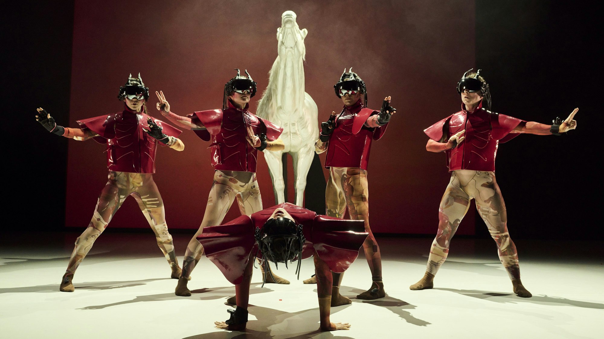 Zunächst. Denn kaum merklich erlangen die Frauen die Souveränität über ihre Körper, die Bewegungen werden komplexer. Sie schlängeln sich erotisch wie Pole-Tänzerinnen, formieren sich zu einer vielköpfigen Skulptur wie eine mythologische Machtfigur, schließlich zum Trupp kriegerischer Amazonen, während hinter ihnen auf den Leinwänden sich gewaltige Gaming-Landschaften auftun: eine Sci-Fi-City mit spermaähnlichen Fahrzeugen, menschenleer-kalte Mondlandschaften, Meere, Feuerkugeln.