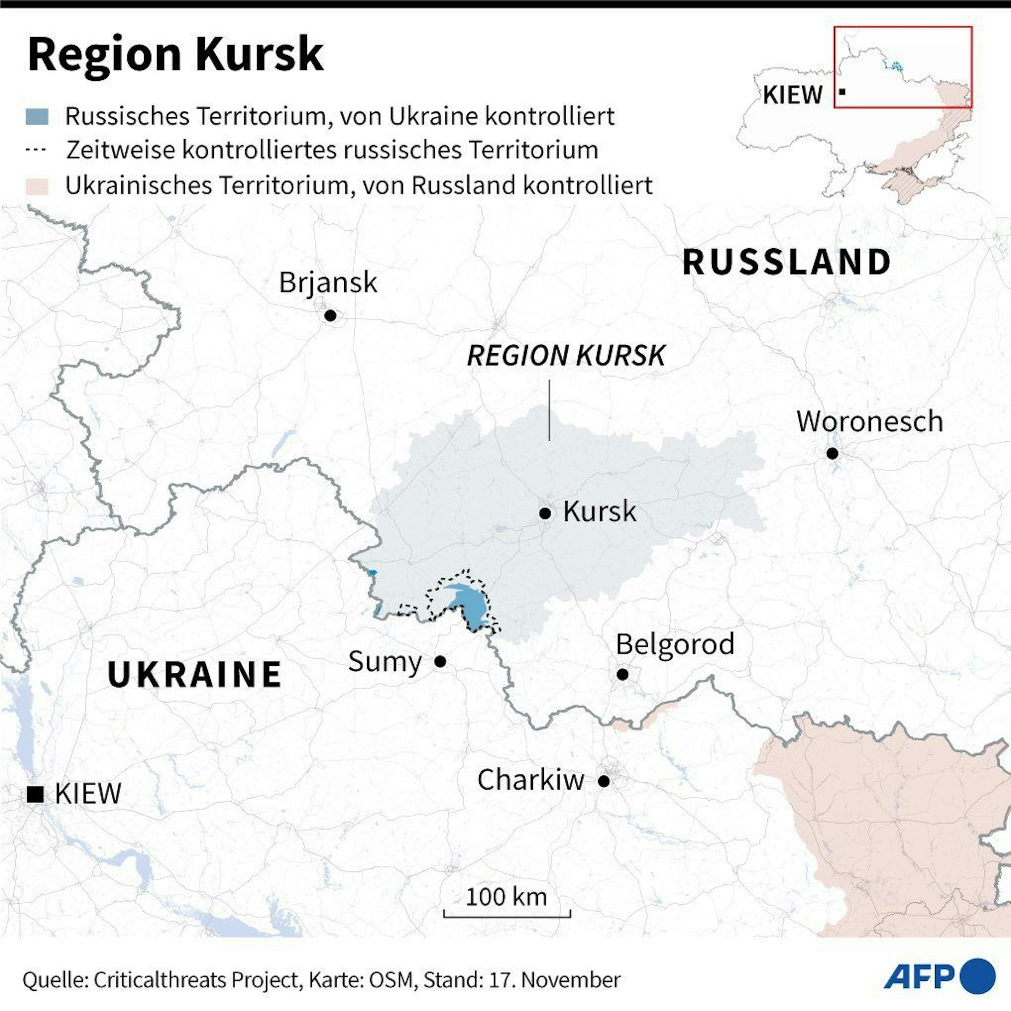 Die ukrainische Armee hat seit ihrem überraschenden Vorstoß in Kursk unterdessen in den letzten Wochen einen großen Teil des eroberten russischen Gebiets wieder aufgeben müssen. Im November hieß es aus ukrainischen Armeekreisen, dass noch rund 800 Quadratkilometer zu diesem Zeitpunkt unter ukrainischer Kontrolle waren. Zuvor hatte die Ukraine laut eigenen Angaben 1400 Quadratkilometer in der Region Kursk besetzt gehalten.