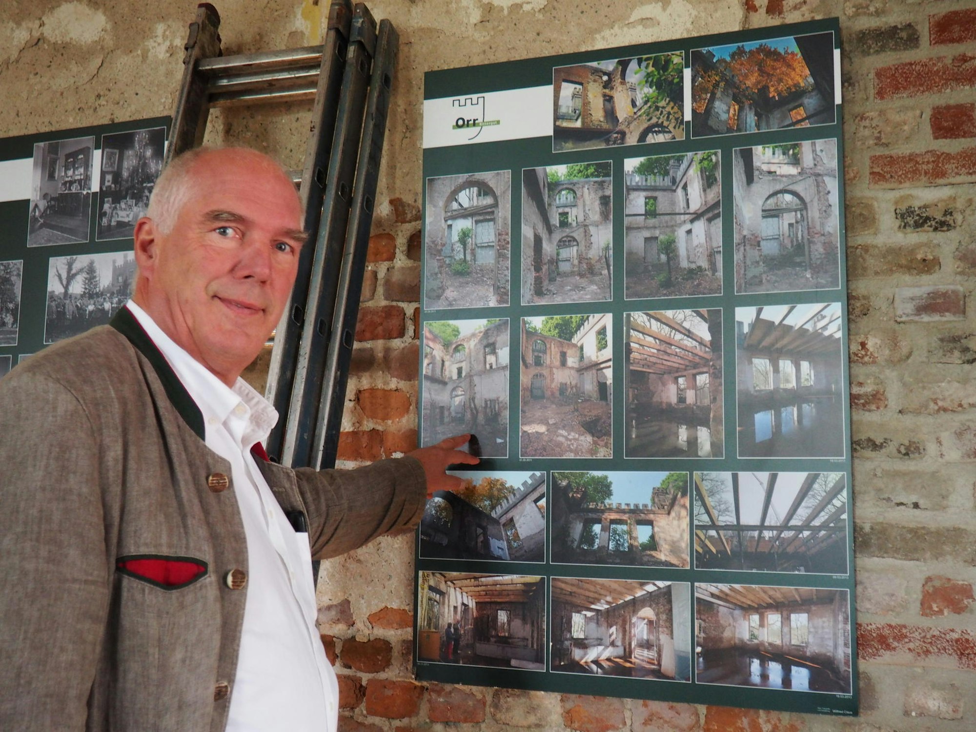 Noch vor Jahren war solch emsiges Treiben in dem denkmalgeschützten Gemäuer undenkbar. Das Dach, aber auch Fenster und Türen fehlten, die Mauern bröckelten. „Bäume wuchsen vom Erdgeschoss in die oberen Etagen“, berichtet Rüdiger Schmidt-Holzmann. Er zeigt eine Foto-Collage im einstigen Foyer, die dokumentiert, in welch ruinösem Zustand sich das verwaiste Herrenhaus vor nicht allzu langer Zeit befand.