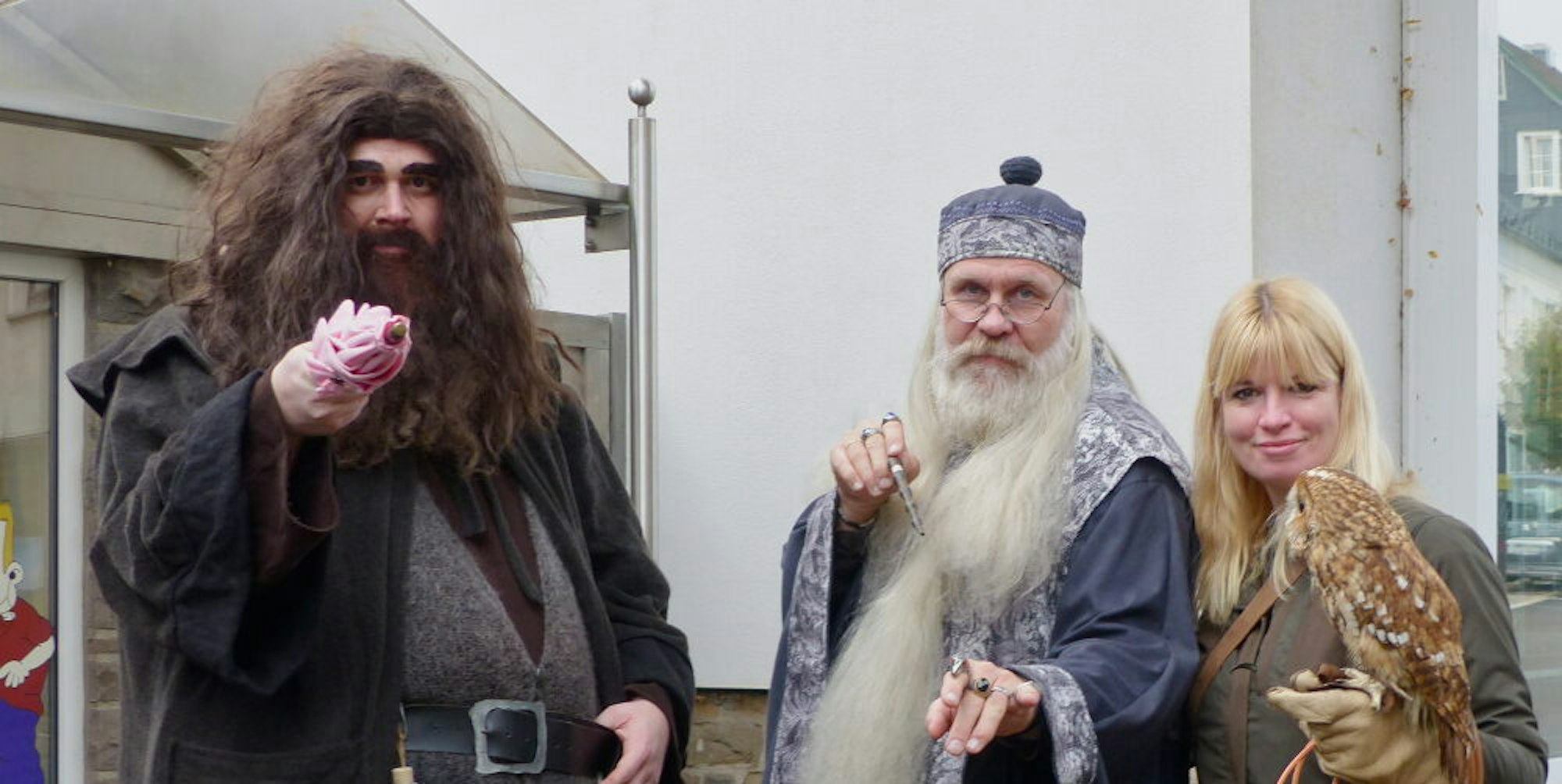 Tom Hansen, der mit seinen langen grauen Haaren und seinem Bart heute als Dumbledore in die Rolle des Schulleiters der Zauberschule Hogwards geschlüpft ist, hatte die Idee zu der Veranstaltung. Der Fotograf arbeitete schon häufig mit Cos-playern zusammen und sprach die Falknerei an, die regelmäßig Mittelaltermärkte und Fotoshootings besucht. „Ich war sofort begeistert von der Idee. Da auf Grund der Corona-Schutzregeln keine Lesung in den Räumlichkeiten stattfinden kann, begrüßen wir unsere Gäste im Freien und veranstalten ein Harry Potter-Quiz, bei dem es nicht nur Süßigkeiten, sondern auch ein Spiel zu der Romanreihe zu gewinnen gibt“, erklärt Freese.