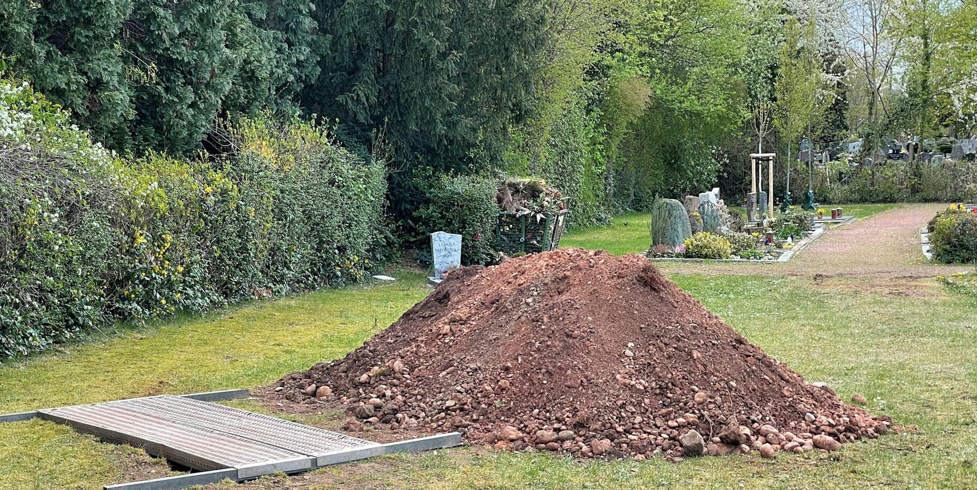 Wie die Euskirchener Polizei am Dienstagnachmittag auf Nachfrage bestätigte, war ein Baggerfahrer auf den Leichnam gestoßen. Laut Pressesprecher Franz Küpper wollte der städtische Mitarbeiter ein Grab für eine Bestattung am Dienstag ausheben. Und zwar in dem Bereich des Friedhofs, der vor zehn Jahren eingeebnet worden war und seit einiger Zeit für muslimische, sarglose Bestattungen gen Mekka genutzt wird.