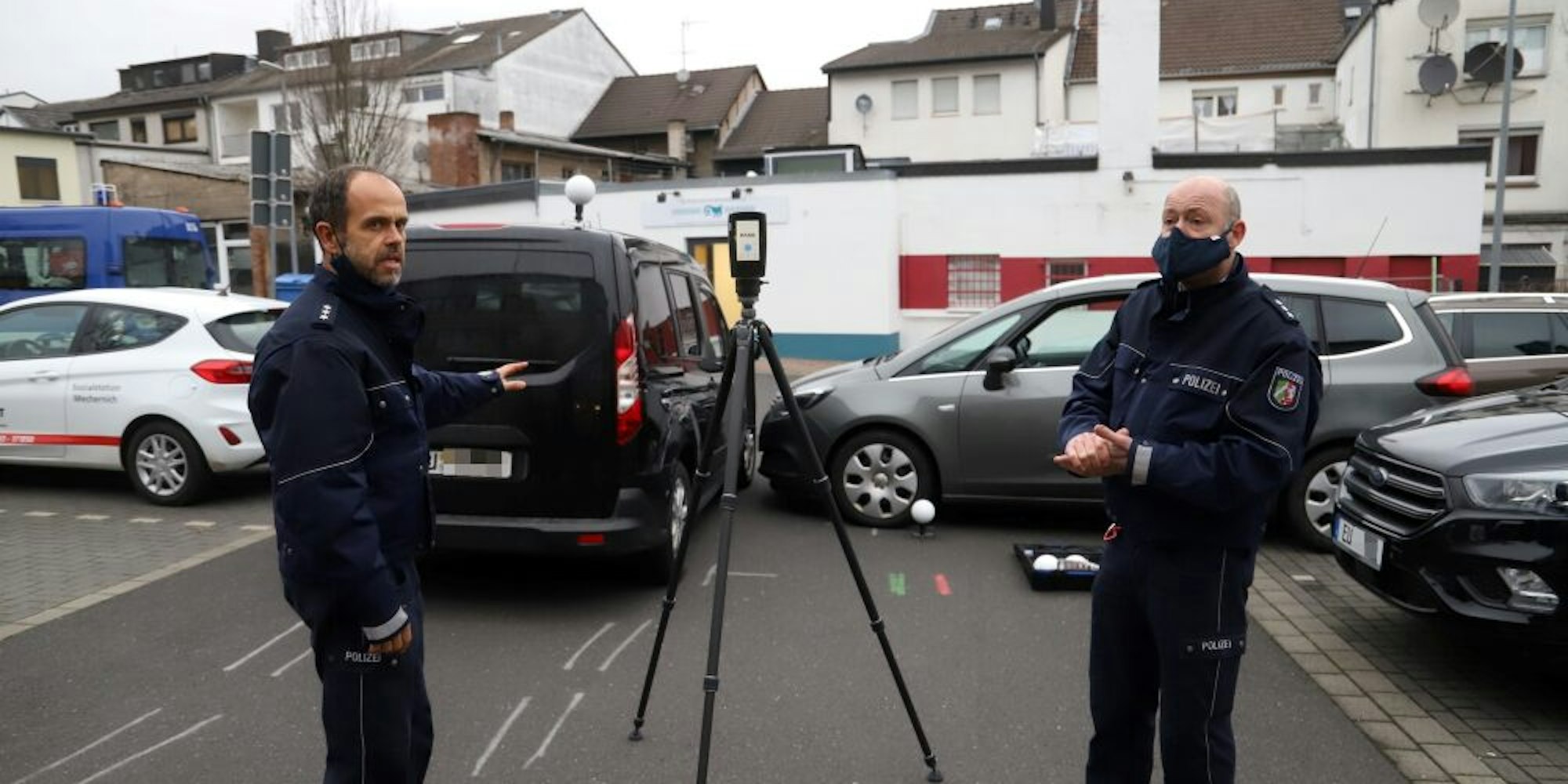 Anhand einer gestellten Unfallszenerie demonstrieren Markus Valder (l.) und Friedrich Lemke die Funktionsweise des neuen 3D-Laserscanners, der die Unfallaufnahme der Polizei revolutionieren soll.