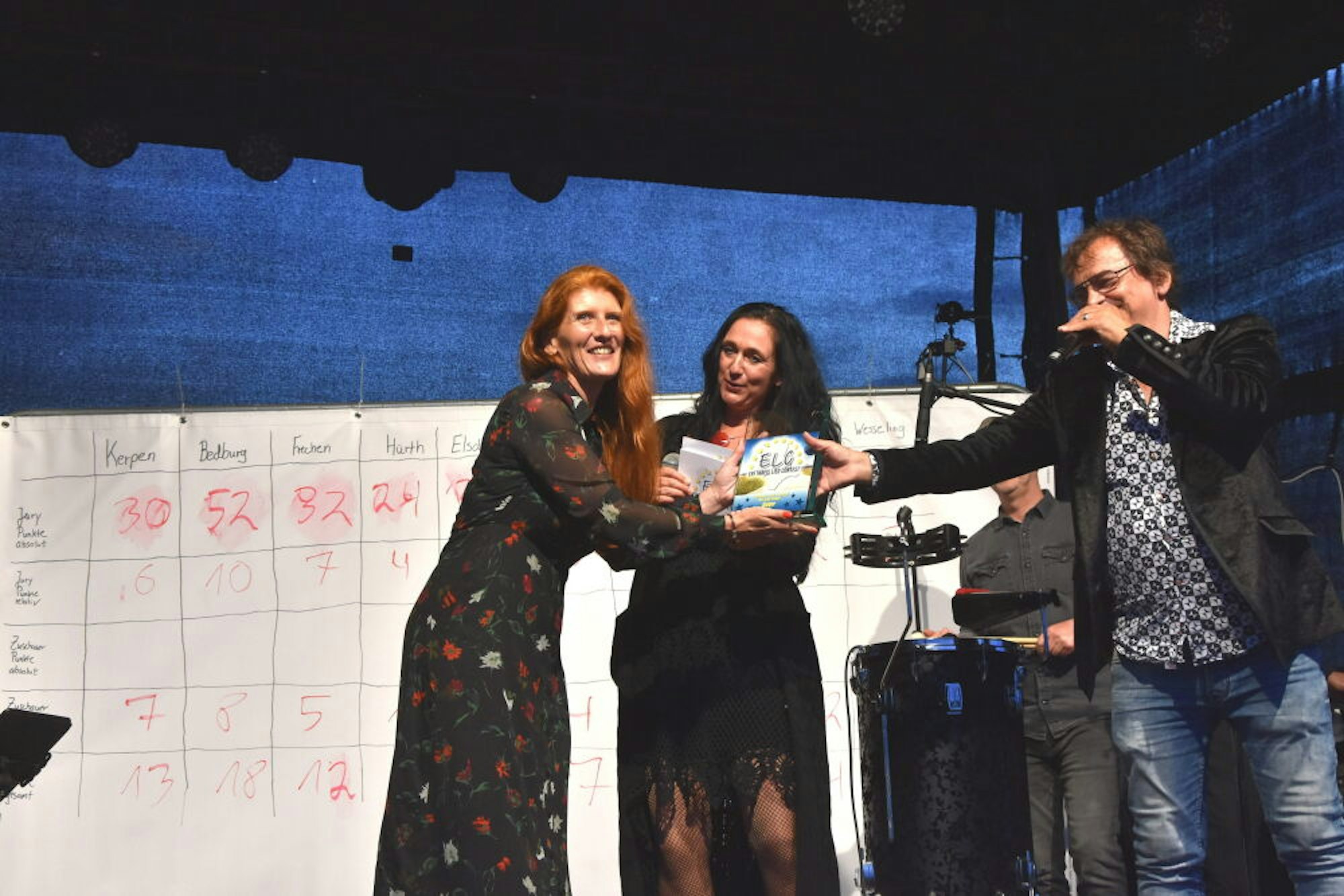 Elsdorf-Berrendorf-Wüllenrath – Zwölf Punkte bekam Angela Lentzen von der Jury und vom Publikum beim ersten ELC (Erftkreis-Liedcontest). Damit holte sie vor rund 400 Zuschauerinnen und Zuschauern auf der Wiese am Forum Terra Nova die Siegertrophäe in die Kreisstadt.