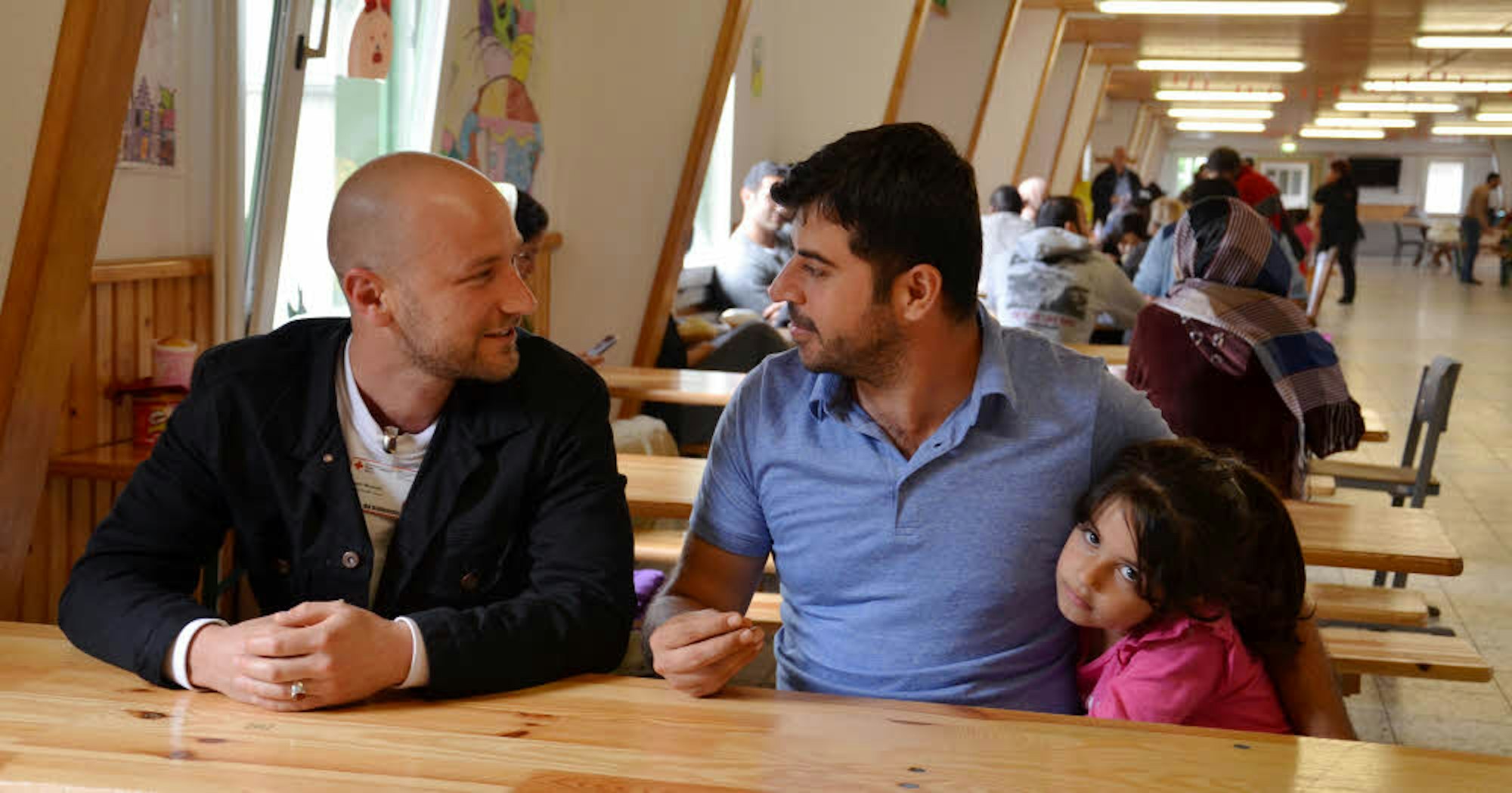 DRK-Mitarbeiter Jasper Wasmuth im Gespräch mit Rabar. Der Agrar-Ingenieur ist mit seiner Familie aus dem Irak geflohen.