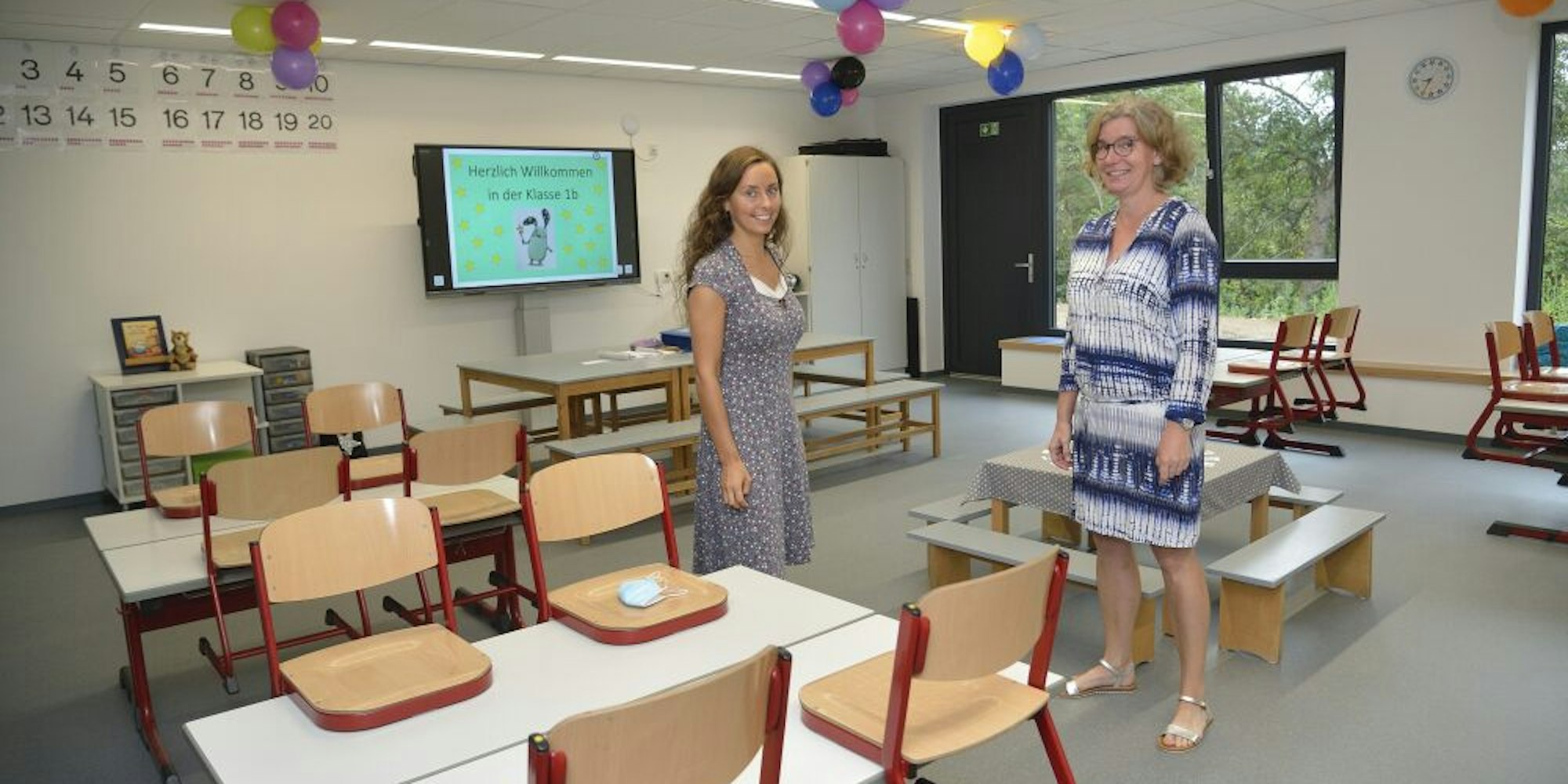 Schulleiterin Donate Radhöfer-Petersen (r.) und Konrektorin Stefanie Jansing im Klassenizmmer.