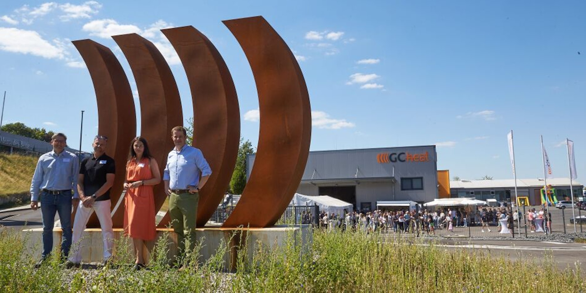 Während des Sommerfestes der Firma haben Bürgermeisterin Larissa Weber und Geschäftsführer Sven Gebhard das Bauwerk eingeweiht. Die Skulptur in der Mitte mit dem vierteiligen, stählernen Logo von GC-heat stammt aus der Werkstatt des Metallbauers Torsten Schöpe aus Nümbrecht-Neuroth, die Bepflanzung übernahm Tim Wehling von Gala-Landschaftsbau Heintze in Waldbröl.