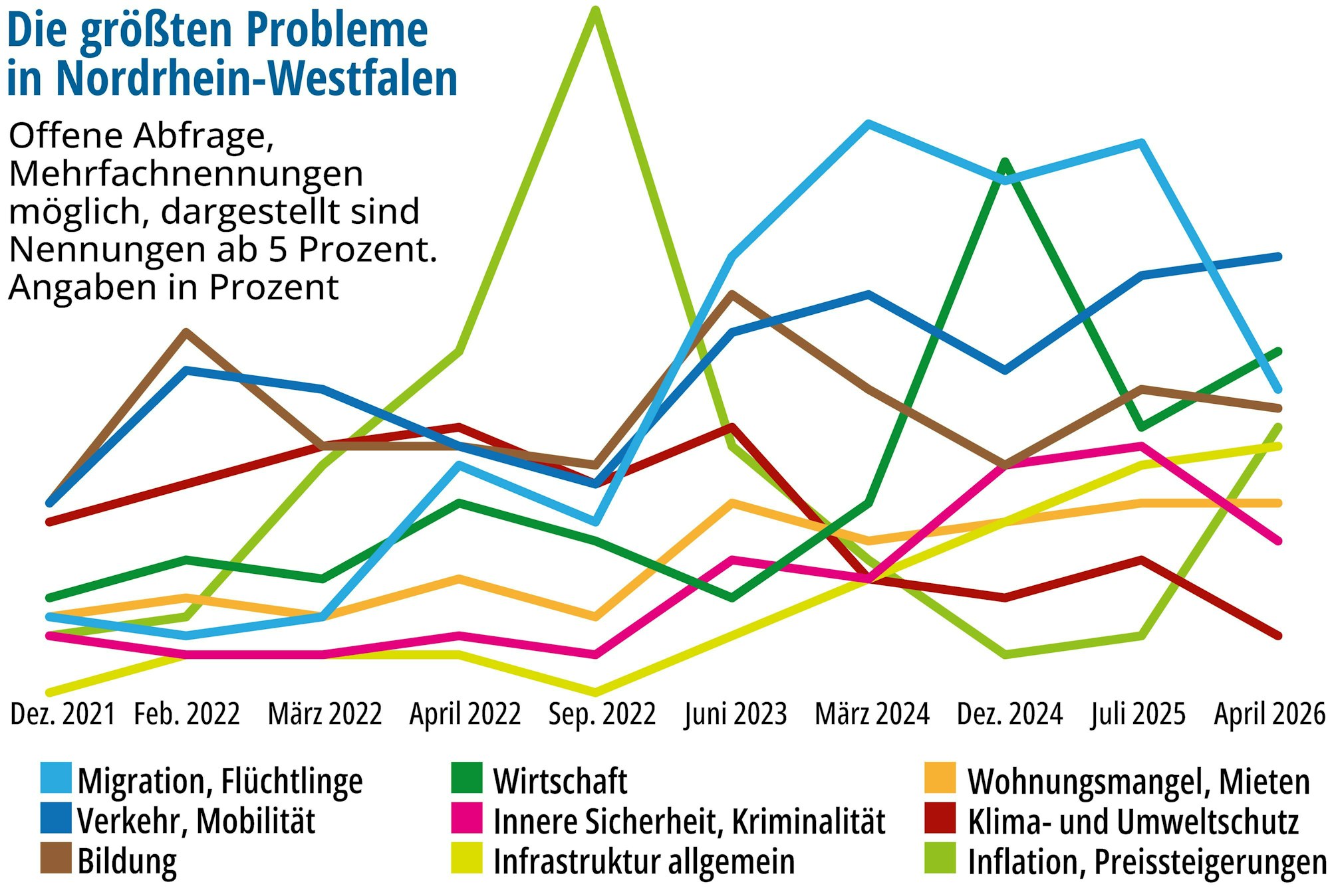 In der aktuellen Umfrage zu den größten Problemen im Land Nordrhein-Westfalen hat sich die Lage der Wirtschaft auf den Spitzenplatz geschoben.