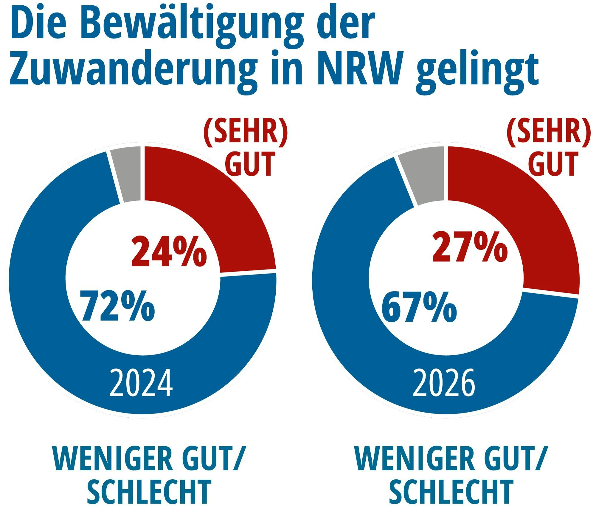 Als die drei größten Probleme des Landes machen die Bürgerinnen und Bürger im aktuellen „NRW-Check“ – wie in den vorangegangenen Befragungen – Verkehr und Mobilität (27 Prozent), die Lage der Wirtschaft insgesamt (22 Prozent) sowie Migration und Flüchtlinge (20 Prozent) aus. Knapp dahinter liegt der landespolitische Dauerbrenner Bildung (19 Prozent). Allerdings haben sich die Prioritäten gegenüber dem „NRW-Check“ aus dem Juli vorigen Jahres zum Teil deutlich verschoben (siehe Grafik).