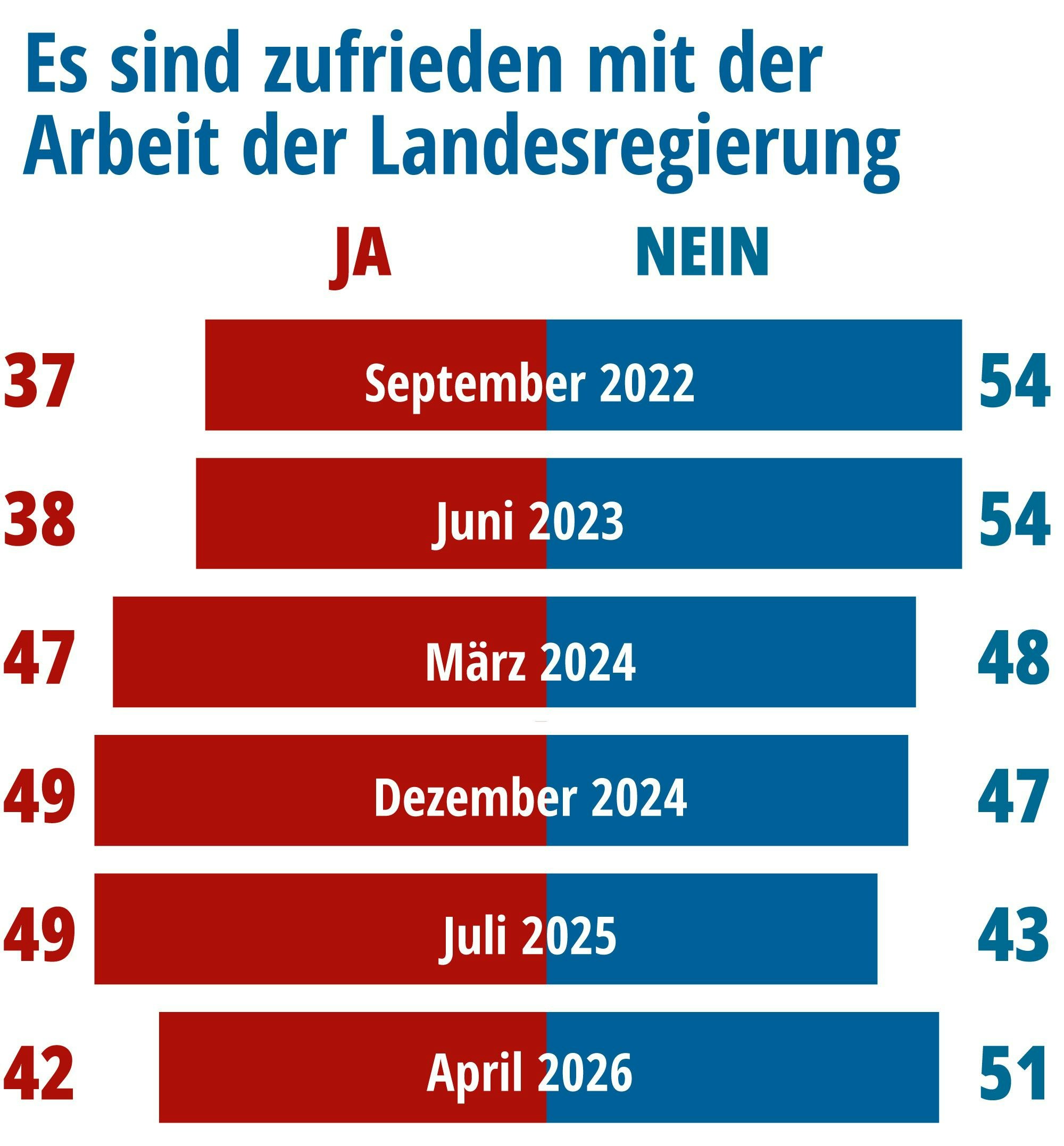 Die Werte für die Zufriedenheit mit der Koalition sind geradezu abgestürzt. Waren sie schon im Juli 2025, kurz nach Amtsantritt der Regierung Merz, mit 37 Prozent schwach, brachen sie um 21 Punkte auf nunmehr 16 Prozent ein. 80 Prozent der Menschen in Nordrhein-Westfalen sind unzufrieden mit der Arbeit der Bundesregierung in Berlin.