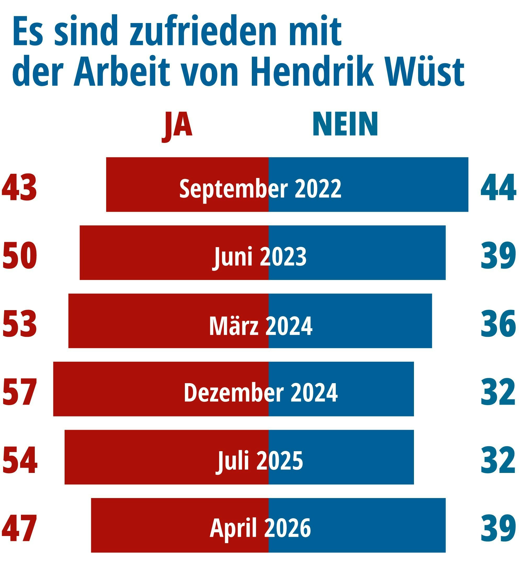 Dabei ist der Zufriedenheitswert der Landesregierung in den vergangenen neun Monaten dramatisch gesunken. Er ging von 49 Prozent im Juli 2025 auf jetzt 42 Prozent zurück. Zum ersten Mal seit mehr als zwei Jahren ist damit der Anteil der Unzufriedenen (51 Prozent) der Menschen in Nordrhein-Westfalen wieder höher als der Anteil der Zufriedenen. Starke persönliche Einbußen mussten auch die Spitzenpolitiker der Koalition, Ministerpräsident Wüst und seine Stellvertreterin Mona Neubaur (Grüne) hinnehmen.