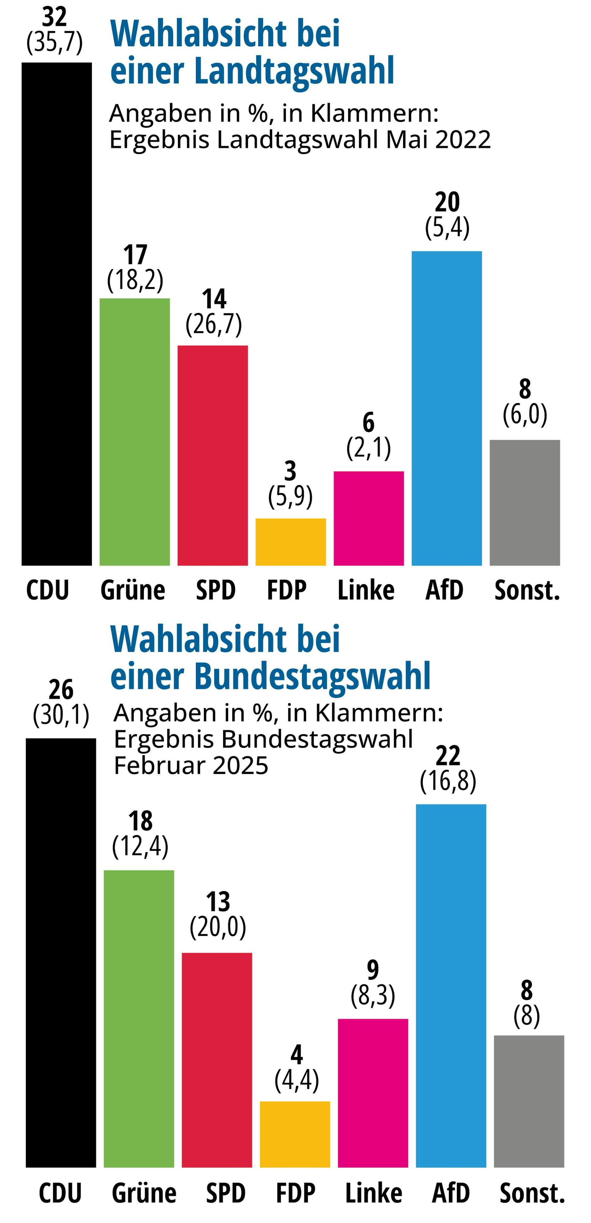 Aktuell liegt die CDU nur noch vier Punkte vor der AfD (22 Prozent), die als jetzt zweitstärkste politische Kraft im gleichen Umfang Stimmen hinzugewinnt. Nutznießer sind zudem die Grünen. Als Oppositionspartei in Berlin legen sie um 5 Punkte zu und erreichen jetzt 18 Prozent. Die Regierungspartei SPD verliert im gleichen Umfang und ist mit jetzt 13 Prozent in einem ihrer Stammländer nur noch viertstärkste Kraft. Die Linke behauptet ihr Umfrage-Ergebnis von 9 Prozent, die FDP verfehlt mit 4 Prozent – wie schon 2025 – die Fünf-Prozent-Marke für den Wiedereinzug in den Bundestag.