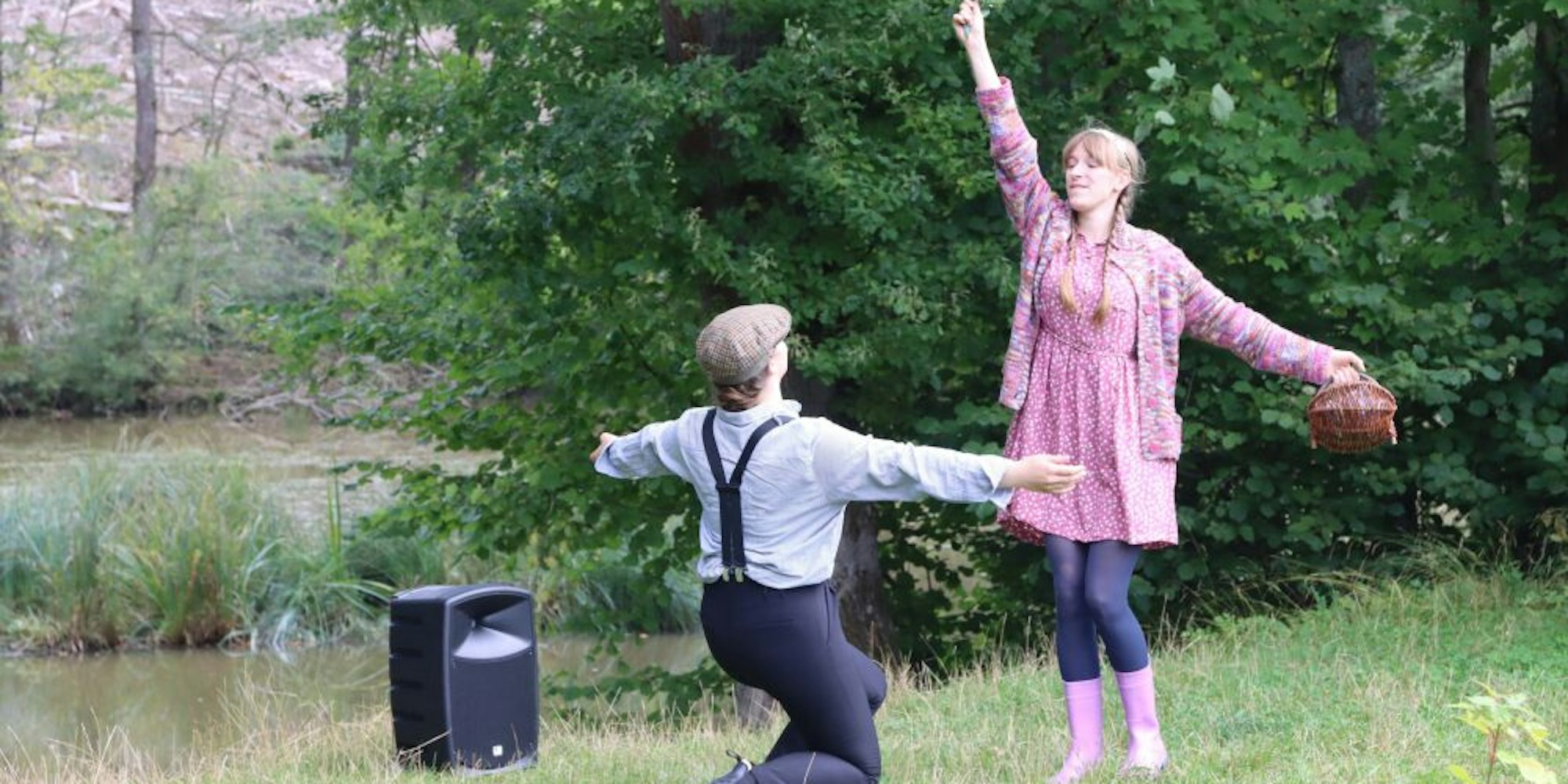 Der „Klangpfad“ war wörtlich zu nehmen: Unter anderem am Hexenweiher spielten Maxi Sophie Mäder (r.) und Alina Berit Göke Szenen aus der Märchenoper.