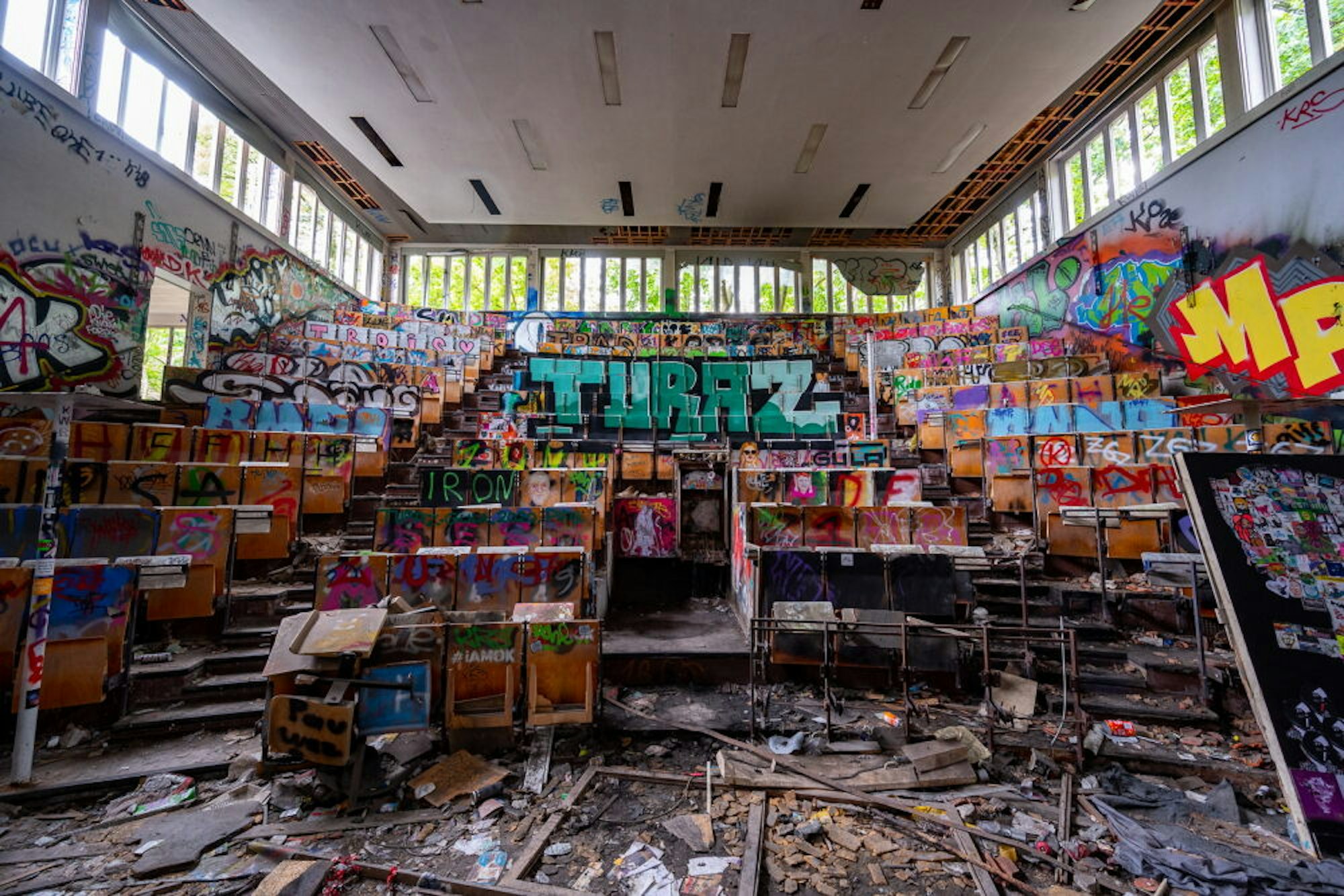 Bilder aus Berlin. Einst anatomisches Zentrum einer Universität in Berlin, heute von unzähligen Sprayern gestaltet. Die Emporen gewährten einst den Studenten freien Blick, wenn der Professor den Leichnam zerlegte