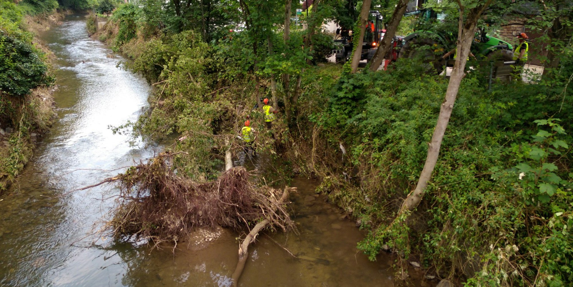 An vielen Stellen der Dhünn müssen Arbeiter des Wupperverbands die Schäden des Hochwassers beseitigen.