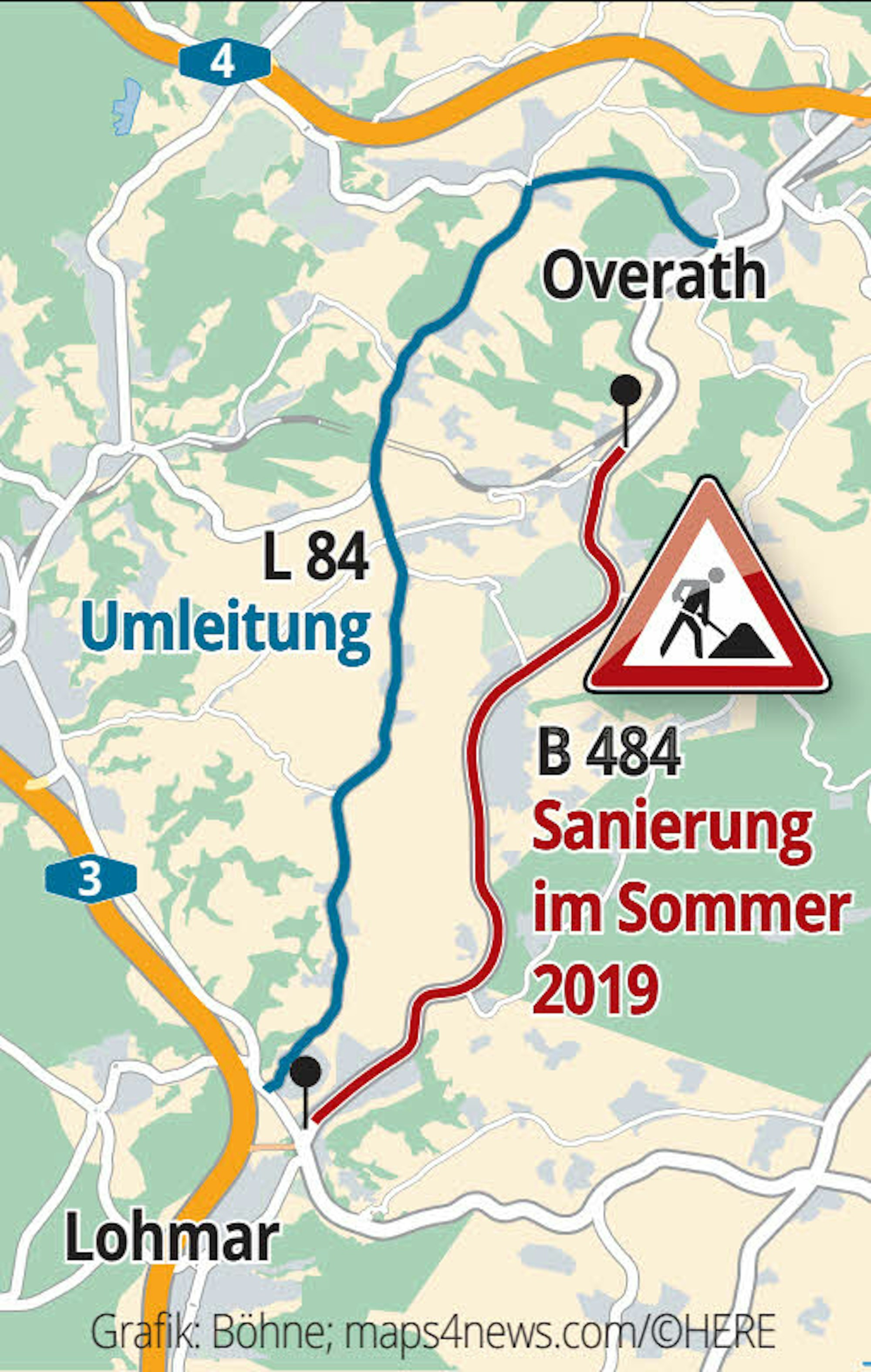 Wie der Overather Baubetriebsamtsleiter Markus Funke im Bauausschuss weiter mitteilte, beginnt die Deckensanierung der B 484 in Lohmar-Donrath und endet an der Stadtgrenze von Overath bei Gut Eichthal. Da die Strecke sehr lang sei, sollen mehrere Bauabschnitte gebildet werden. Eine örtliche Umleitung sei nur anfangs in Donrath möglich.