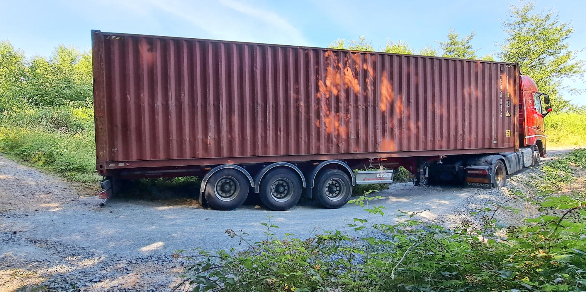 Seit gestern steht fest: Eine Gefahr für die Umwelt geht von dem festgefahrenen Lkw nicht aus. Zu dem Ergebnis sind zumindest laut Kreissprecherin Nina Eckardt Polizei, Landesbetrieb Wald und Holz sowie die Umweltbehörde des Kreises bei einem gemeinsamen Ortstermin gekommen. Zwischenzeitlich habe auch der Eigentümer des Lkw ermittelt werden können.