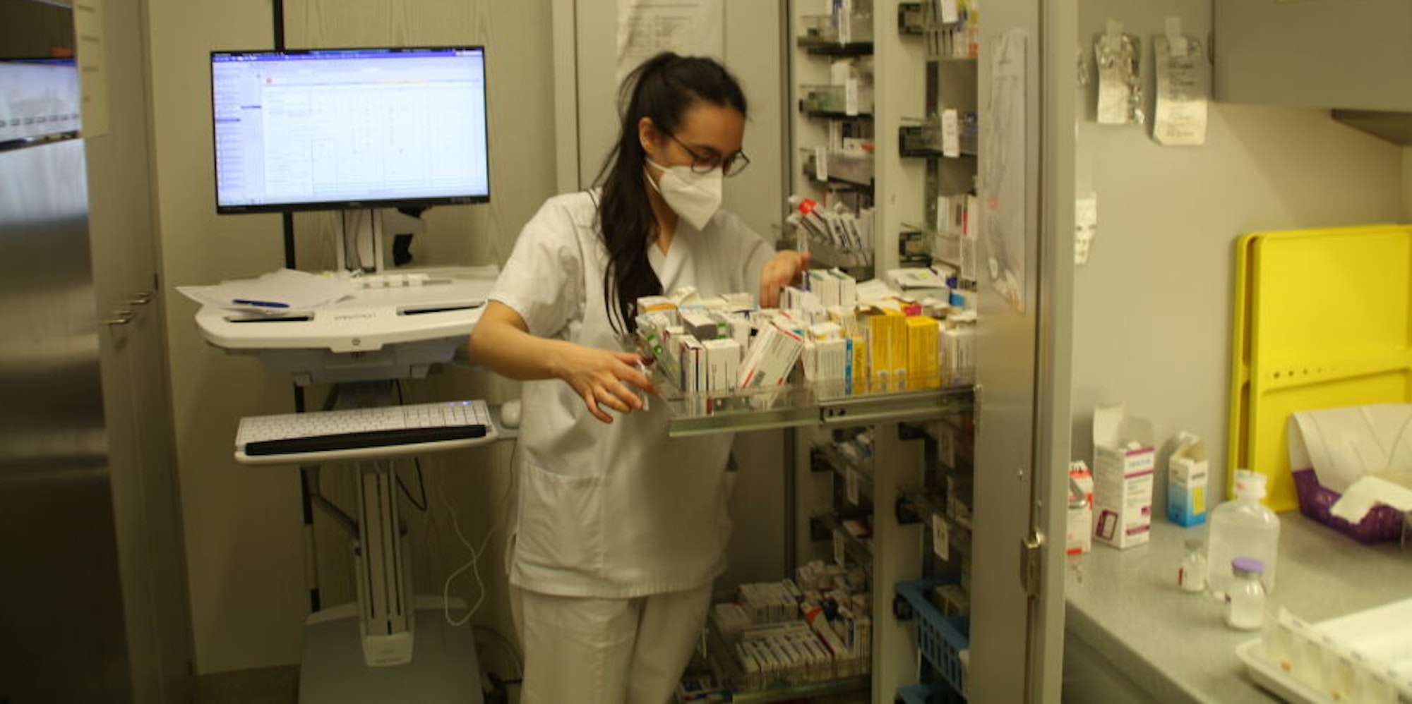 Castro Pinzon sortiert die Medikamente der nächsten Tage für die Patienten. Die 28-Jährige berichtet, warum sie sich für den Pflegeberuf entschieden hat, während besonders während der Corona-Pandemie immer mehr Pflegekräfte gekündigt haben: „Meine Motivation ist, dass die Patienten nach Hause gehen und es ihnen besser geht. Und die Dankbarkeit der Patienten.“