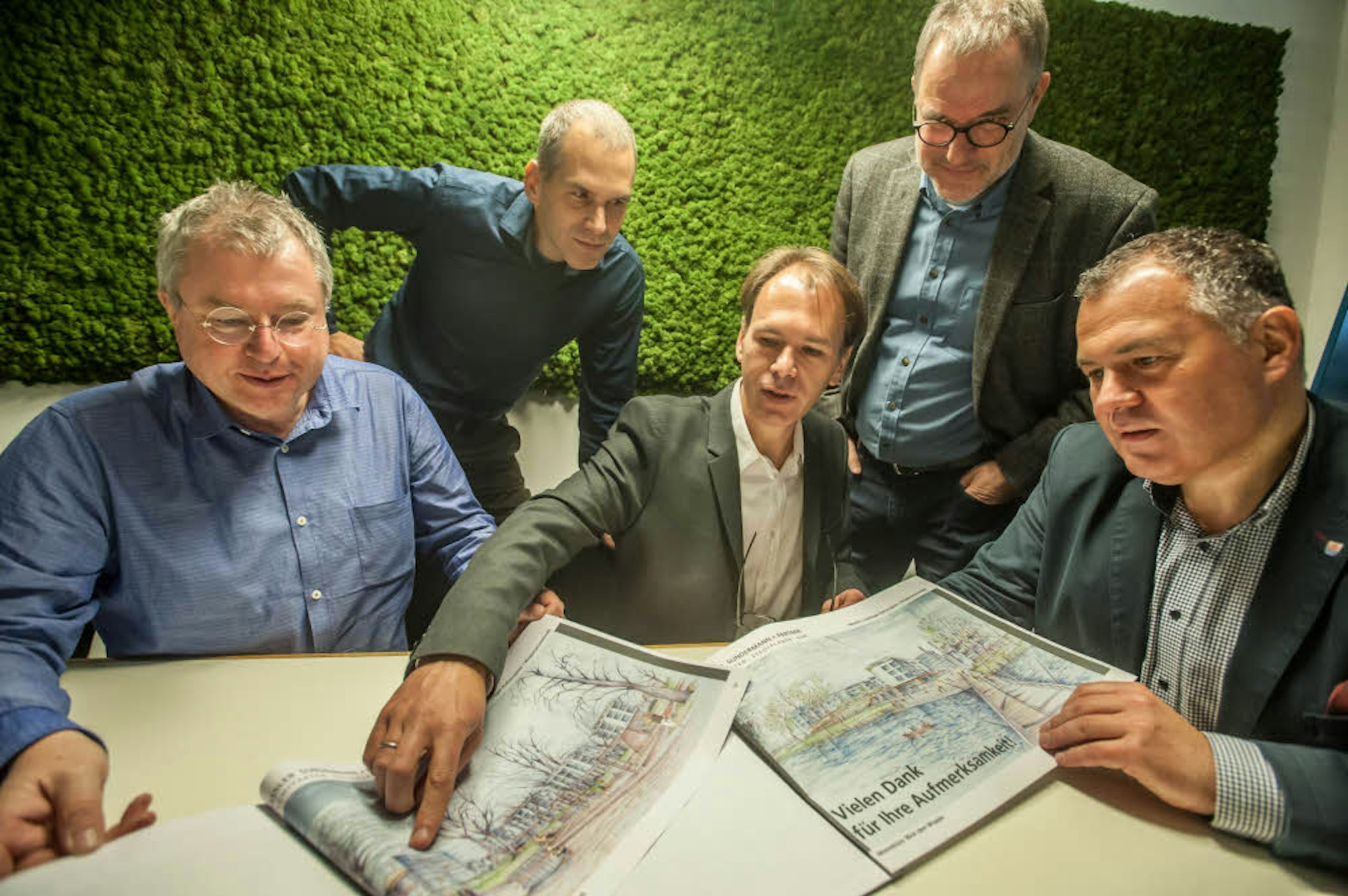 Die Architekten (von links) Michael Sundermann, Martin und Andreas Pässler und Clemens von Dryander stellten gestern mit Bürgermeister Steffes die Neubaupläne fürs Wuppergrundstück vor.