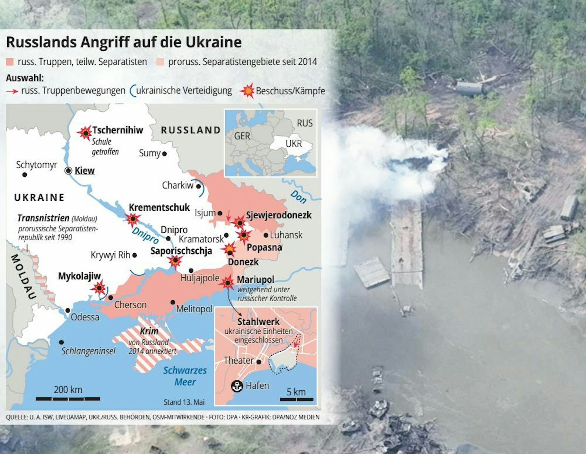 Diese großen Pläne hat Russland nach übereinstimmender Analyse des ISW und des britischen Verteidigungsministeriums aufgegeben. Stattdessen unternimmt man kleinere Umfassungsoperationen. So versuchen russische Truppen die 100 000-Einwohner-Stadt Sjewjerodonezk, Verwaltungssitz des Oblasts Luhansk, sowie die Nachbarstadt Lyssytschansk am Siwerskyj Donez einzukreisen – bisher ohne Erfolg.