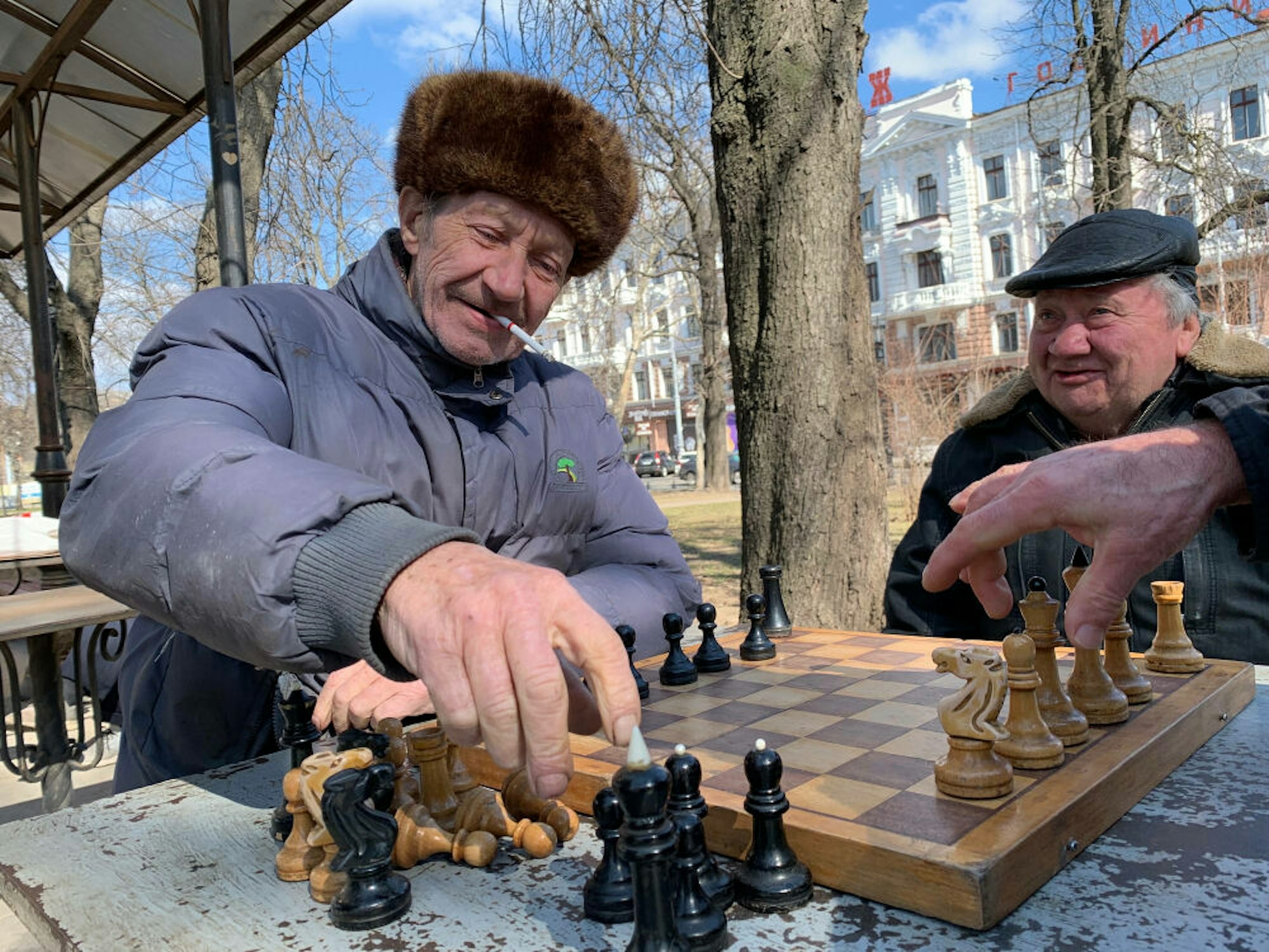 Trotz des Krieges lassen sich diese Männer in einem Park in Odessa nicht von ihrer Lieblingsbeschäftigung abbringen.