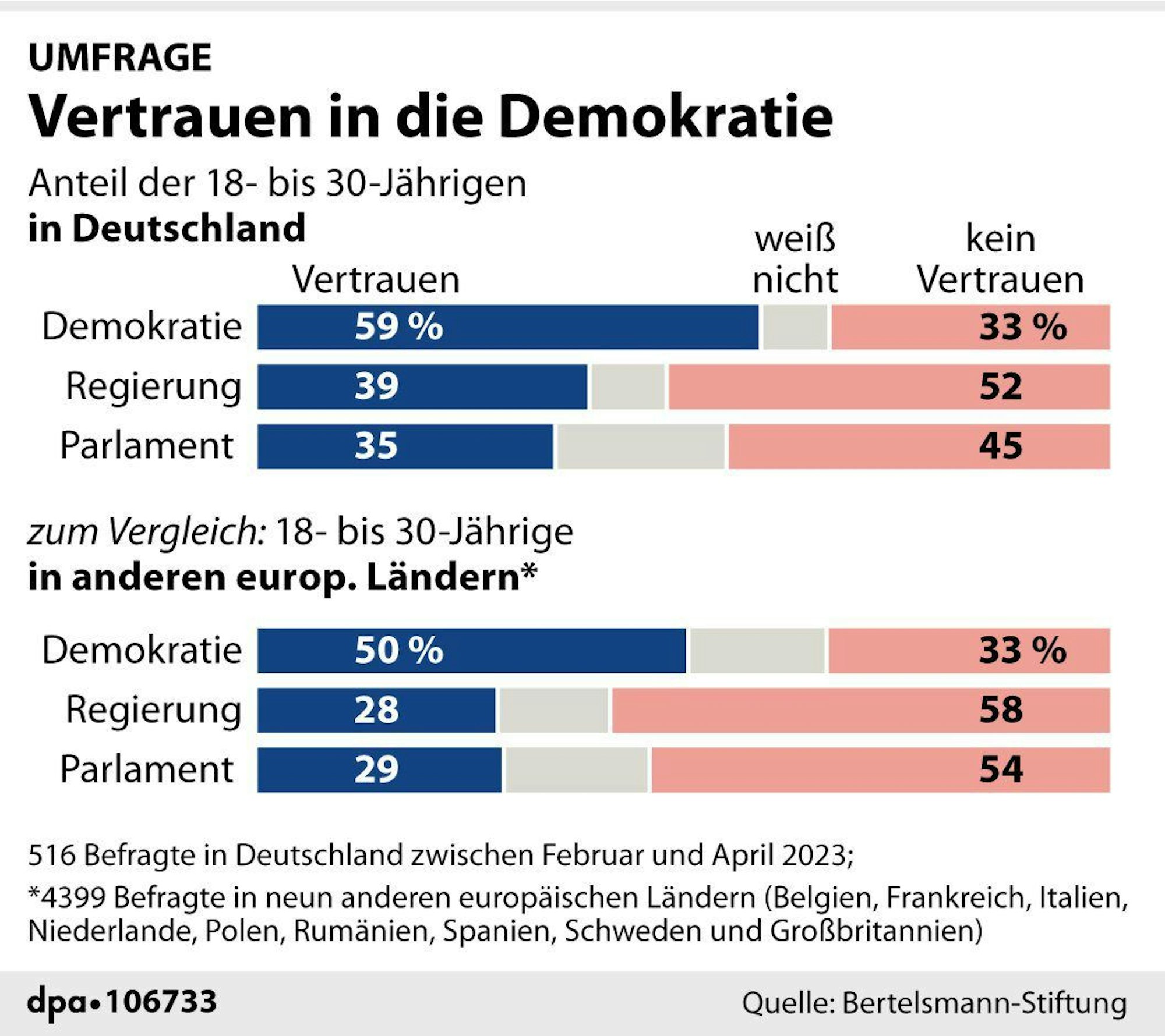 Obwohl das Vertrauen in die Demokratie unter jungen Deutschen vergleichsweise ausgeprägt ist, misstrauen viele von ihnen Regierung und Parlament. Wie eine am Dienstag vorgestellte Studie der Bertelsmann-Stiftung mit Umfragedaten aus dem Vorjahr zeigt, setzen mit 59 Prozent der befragten 18- bis 30-Jährigen zwar mehr Menschen Vertrauen in die Demokratie als im Durchschnitt von neun anderen europäischen Ländern (50 Prozent). Das Misstrauen gegenüber der handelnden Politik ist dagegen auch hierzulande weit verbreitet: Mehr als jeder zweite befragte junge Erwachsene aus Deutschland (52 Prozent) gab an, der Regierung nicht zu vertrauen, 45 Prozent misstrauen dem Parlament.