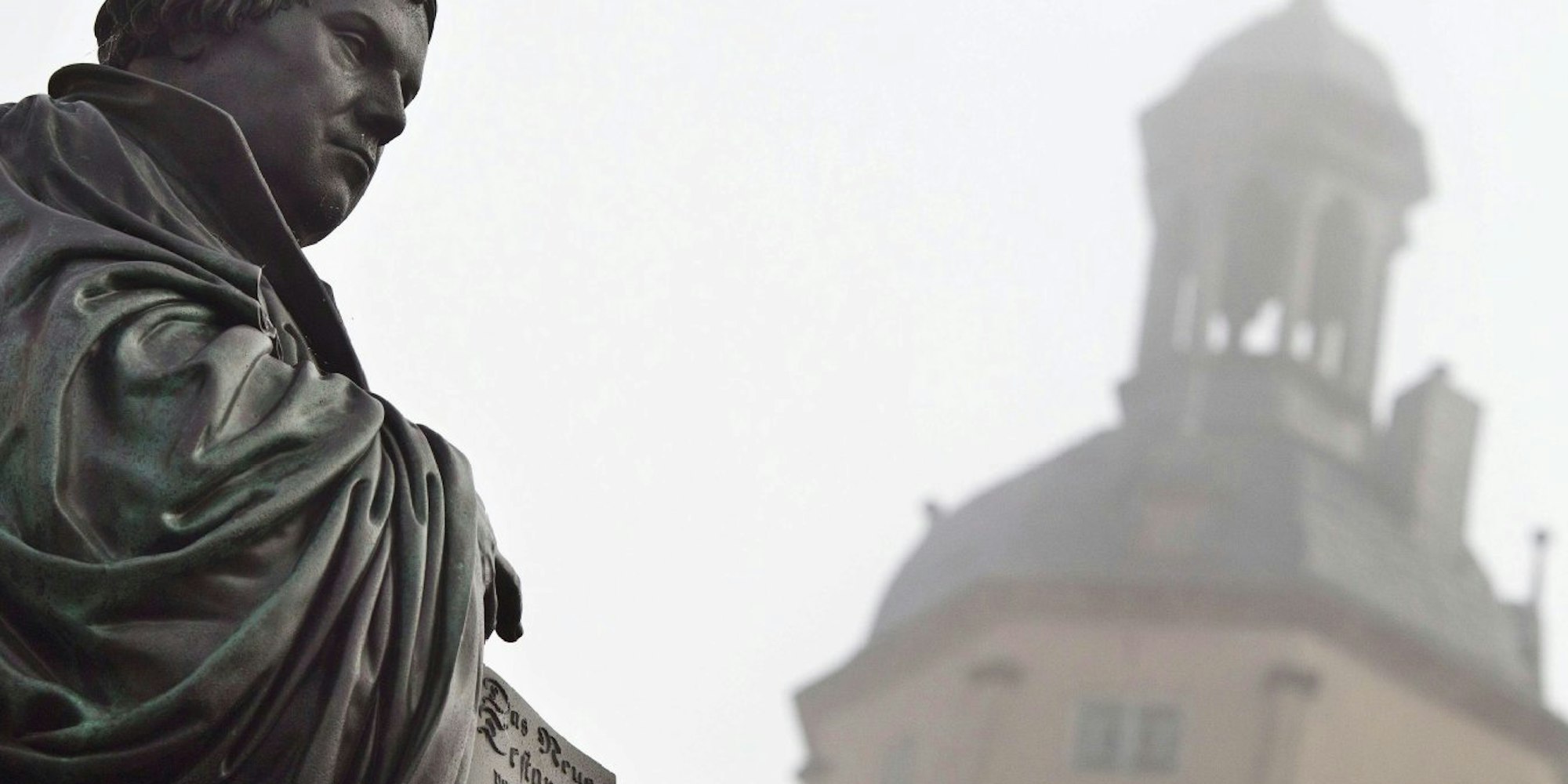 Symbolbild Religion: Das gusseiserne Denkmal für den deutschen Reformator Martin Luther (1483-1546) auf dem Marktplatz der Lutherstadt Wittenberg.