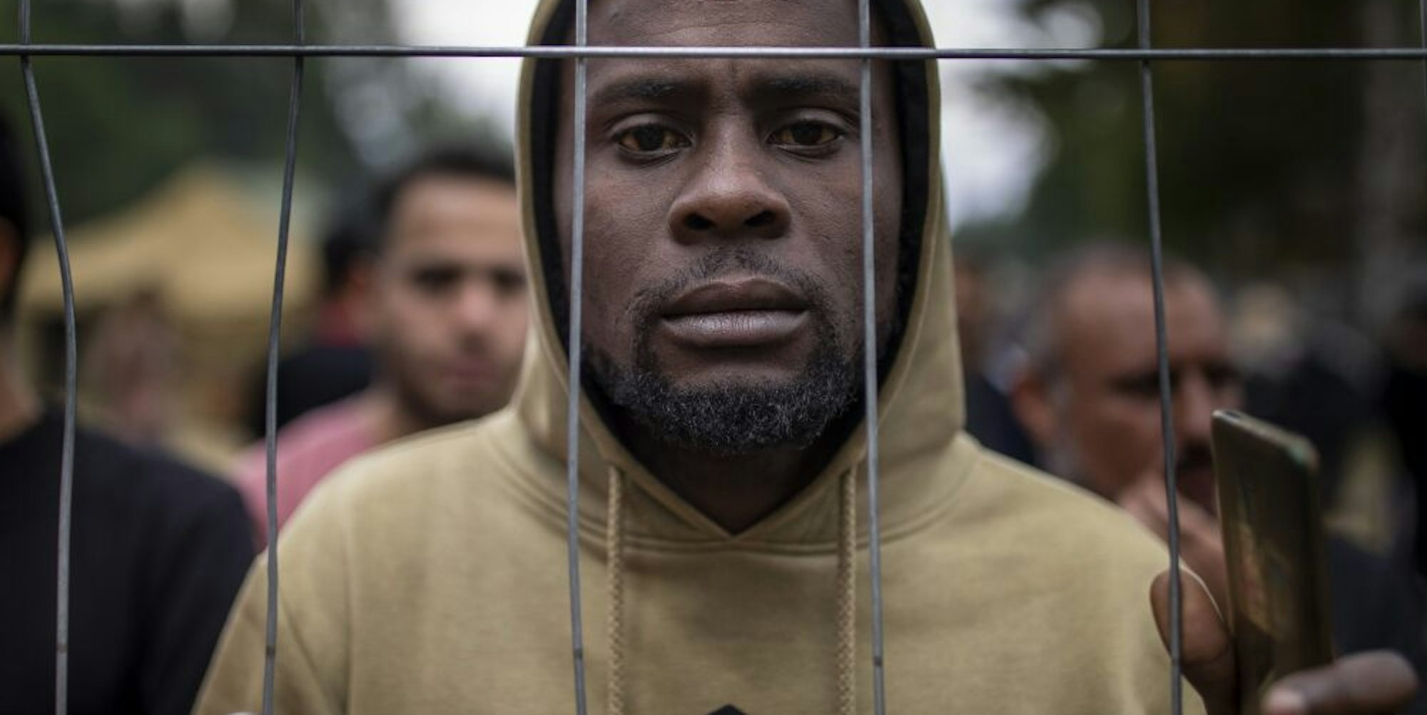 Migranten am Zaun eines neuen Auffanglagers in Litauen, kurz hinter der Grenze zu Belarus.