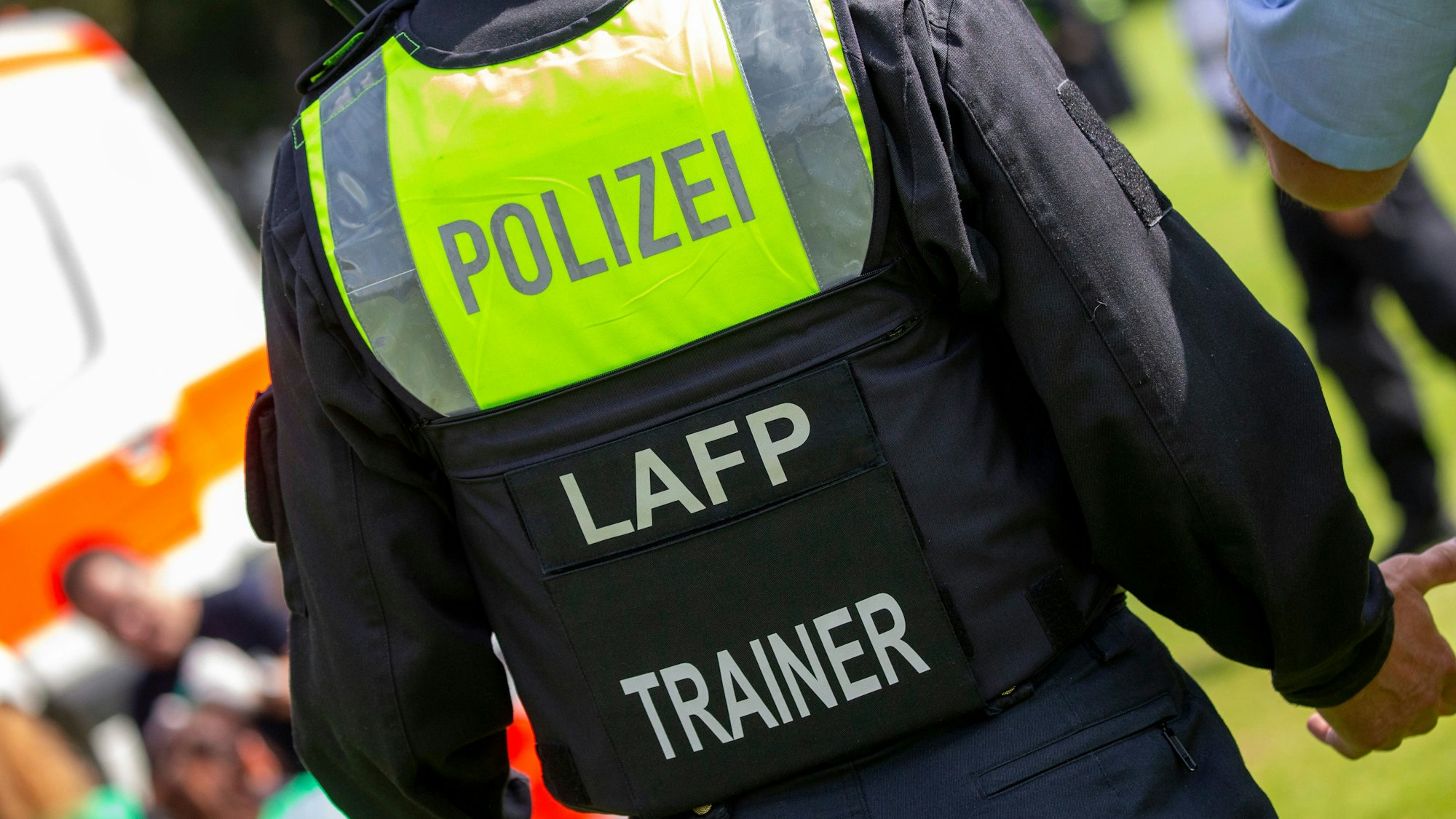 Ein Ausbilder der Polizei bei einer Polizeigroßübung in Köln im Jahr 2023.