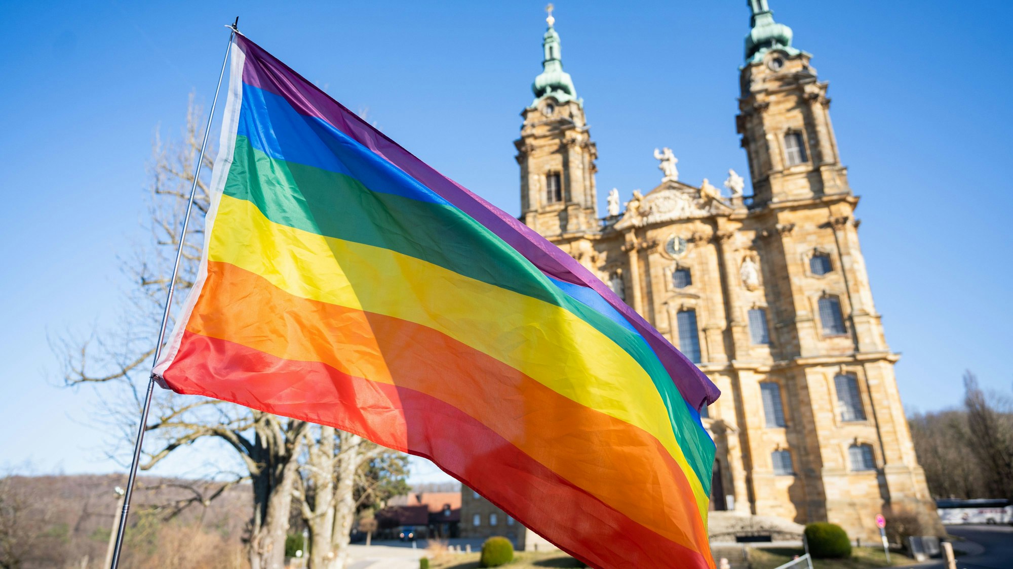 Protest bei der Frühjahrs-Vollversammlung der deutschen Bischöfe: Eine Regenbogenflagge vor der Basilika Vierzehnheiligen.