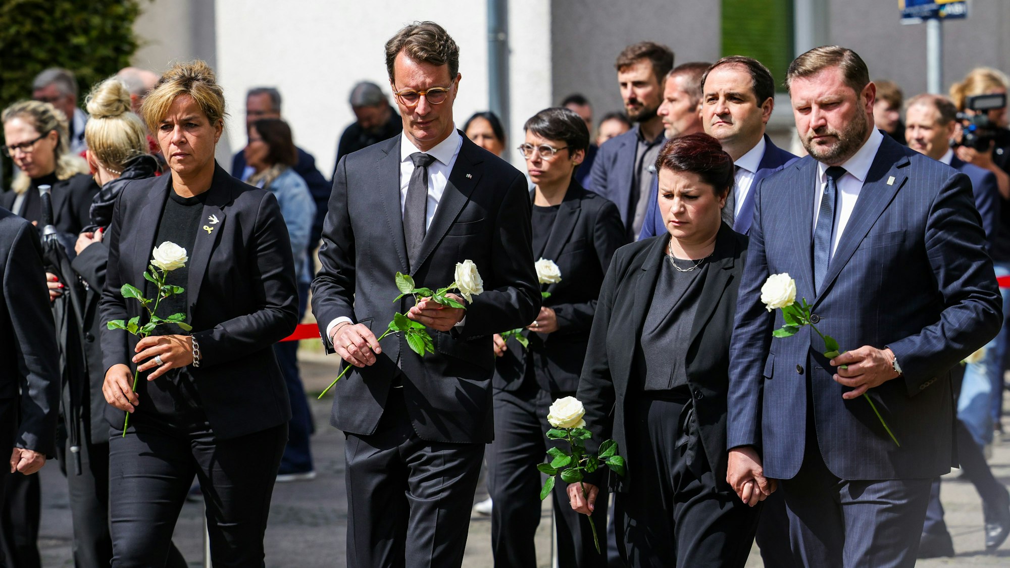 NRW-Hendrik Wüst und weitere Politikerinnen sowie Politiker beim Gedenken am Wochenende in Solingen.