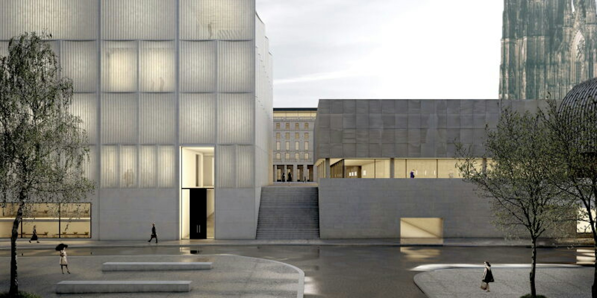 Umstrittenes Vorhaben: Das neue Stadtmuseum (links), daneben das sanierte Römisch-Germanische Museum (rechts).