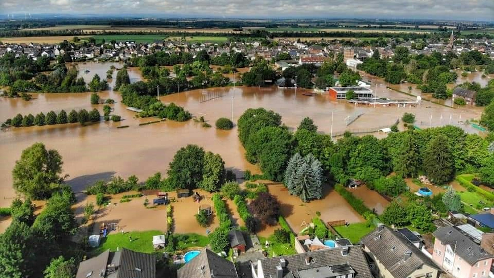 Die Luftaufnahme zeigt die Ausmaße der Flutkatastrophe im Jahr 2021 in Erftstadt-Bliesheim.