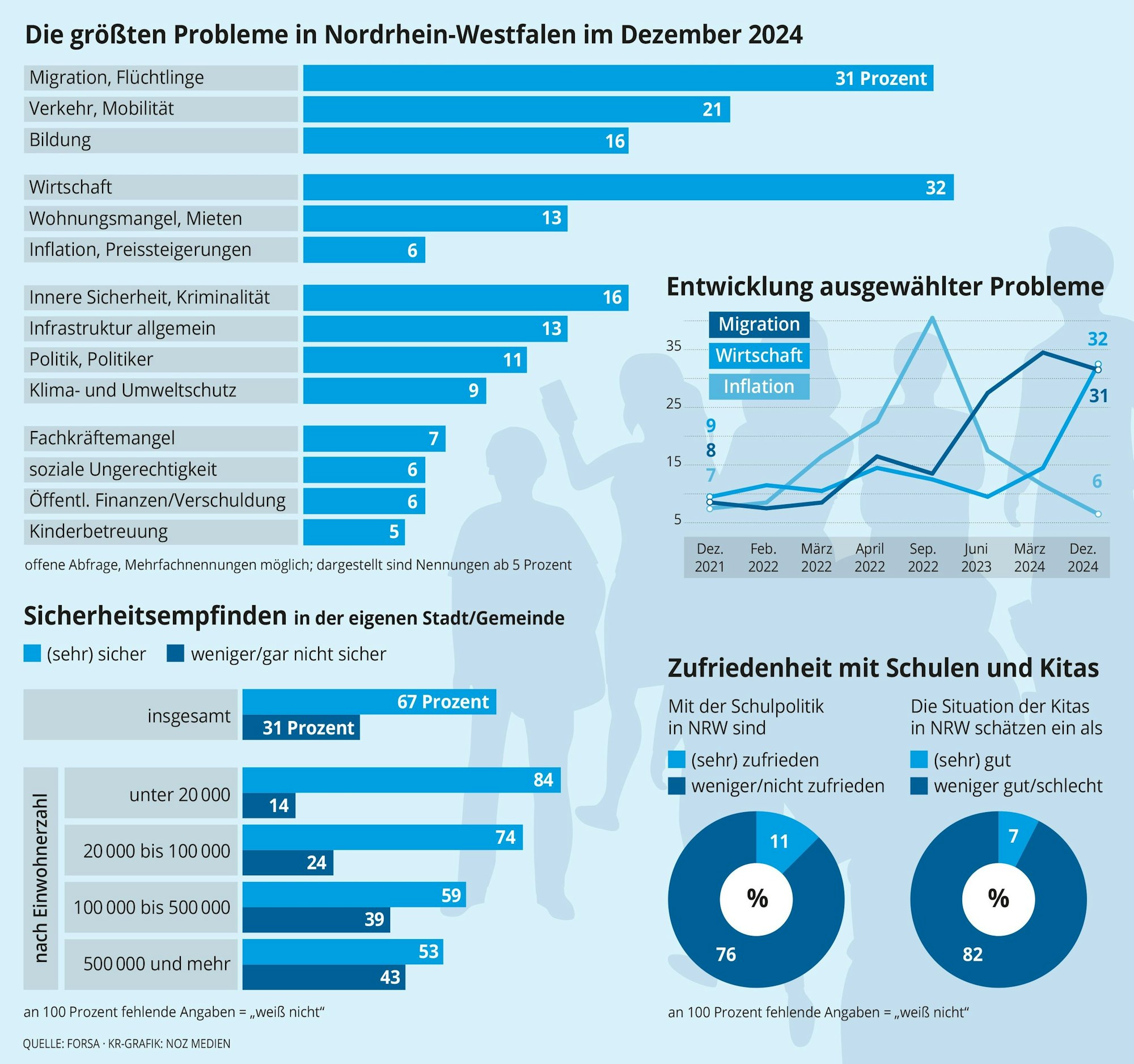 Wirtschaft und Inflation, Migration oder auch die Entwicklung der Kriminalitätsrate und das Sicherheitsempfinden: Diese Themen bewegen die Menschen in NRW zurzeit besonders stark. Ein Überblick
