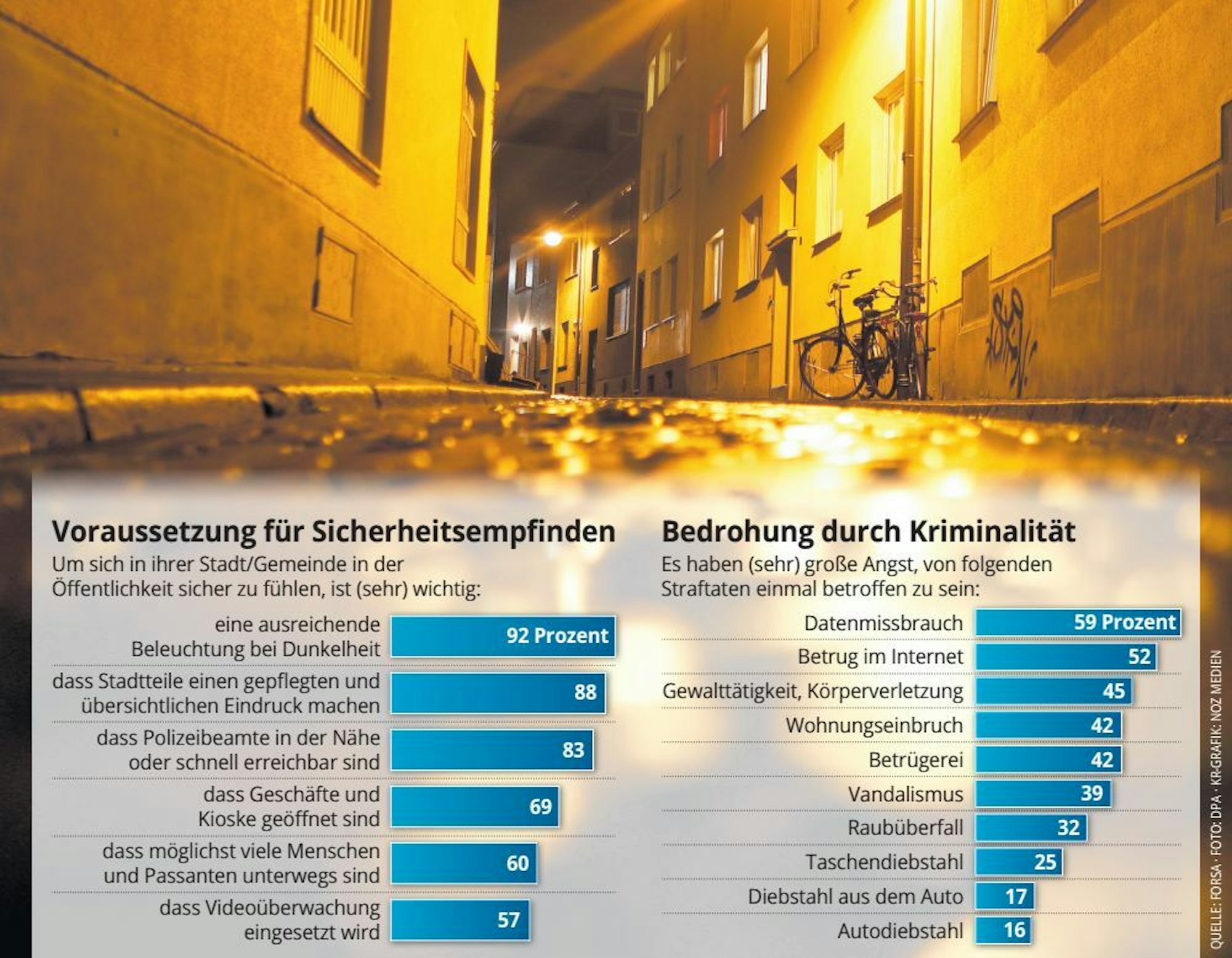 Vor allem Datenmissbrauch und Betrug im Internet machen den Menschen in NRW Sorgen. (Siehe Grafik.) Vor Gewalttätigkeit und Körperverletzung sorgten sich außerdem 45 Prozent der Teilnehmer. Dabei wurde deutlich, dass Frauen (50 Prozent) sich häufiger als Männer (39 Prozent) fürchten, Opfer von Gewalt oder Körperverletzung zu sein. Ein ähnliches Bild zeigt sich bei der Frage nach der Angst vor einem Wohnungseinbruch: 49 Prozent der Frauen gaben an, sich davor zu fürchten, 35 Prozent der Männer. Überhaupt gaben Frauen bei den meisten Kriminalitätsformen öfter an besorgt zu sein als die Männer. Gleich viel Angst haben beide Geschlechter vor Vandalismus – jeweils 39 Prozent. Etwas mehr fürchten sich außerdem die Männer (42 Prozent) vor Betrügerei als die Frauen (41 Prozent).