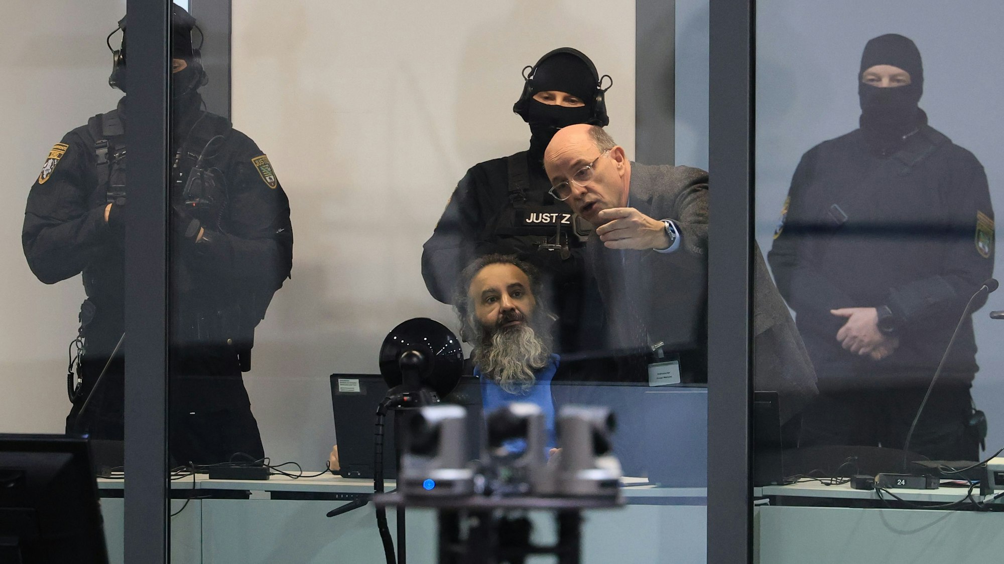 Der Angeklagte Taleb al-Abdulmohsen (M) und ein Dolmetscher unterhalten sich zu Beginn der Verhandlung in Magdeburg.
