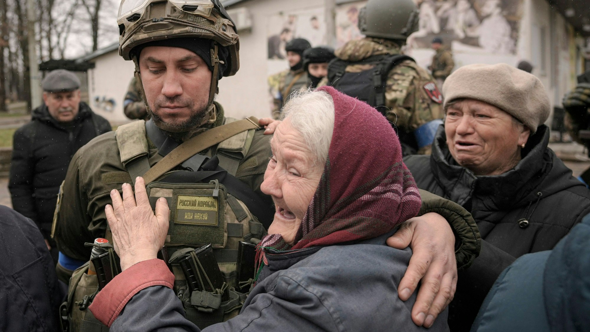Nach der Befreiung: Eine alte Frau umarmt in Butscha einen ukrainischen Soldaten, April 2022.