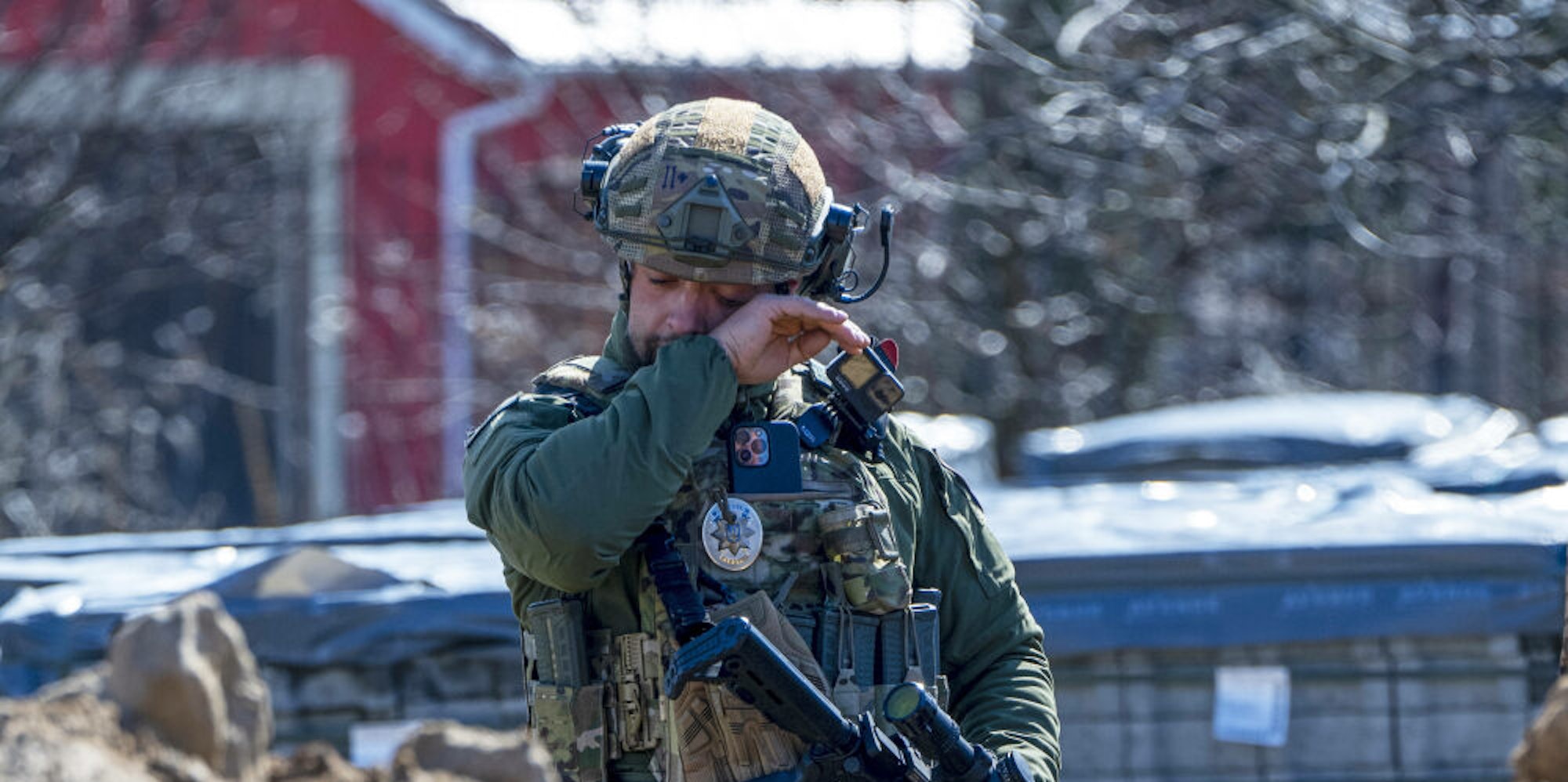 Ein ukrainischer Soldat kämpft in Anbetracht der Trümmer in Butscha mit den Tränen.