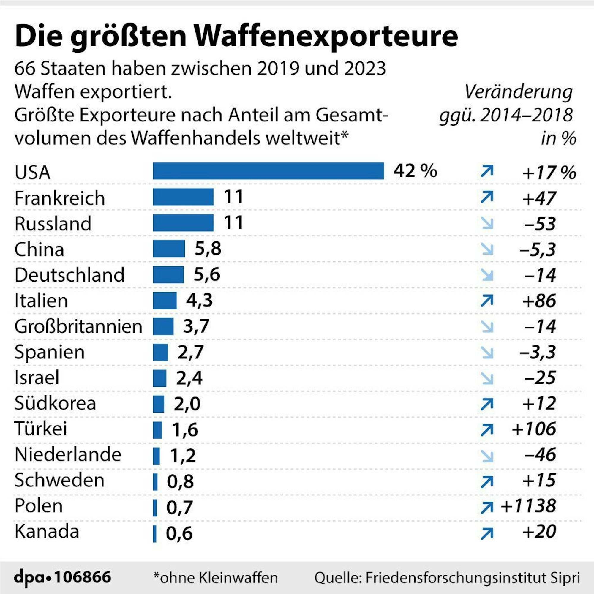 Während Russland 2019 wichtige Waffen in 31 Staaten exportierte, waren es im vergangenen Jahr nur noch zwölf. Mit 11 Prozent am weltweiten Exportvolumen rangiert Russland damit auf Platz drei hinter Frankreich – mit zehn Prozentpunkten weniger als im vorherigen Vergleichszeitraum. Die drei größten Abnehmer russischer Waffen sind dabei Indien, China und Ägypten. Die USA blieben unangefochten auf Platz eins der Exporteure: Im Zeitraum 2019 bis 2023 belieferten sie 107 Staaten. Das sind mehr als in jedem anderen Fünfjahreszeitraum zuvor und weit mehr als jeder andere Waffenexporteur. Ganze 42 Prozent der weltweiten Waffenlieferungen gehen auf den Großlieferanten zurück – ein globaler Anstieg um 8 Prozentpunkte zum vorherigen Vergleichszeitraum. Gefolgt von Frankreich, Russland, China und Deutschland auf dem fünften Platz der weltweiten Waffenlieferanten – alle zusammen machten etwa 75 Prozent der gesamten Waffenexporte aus.