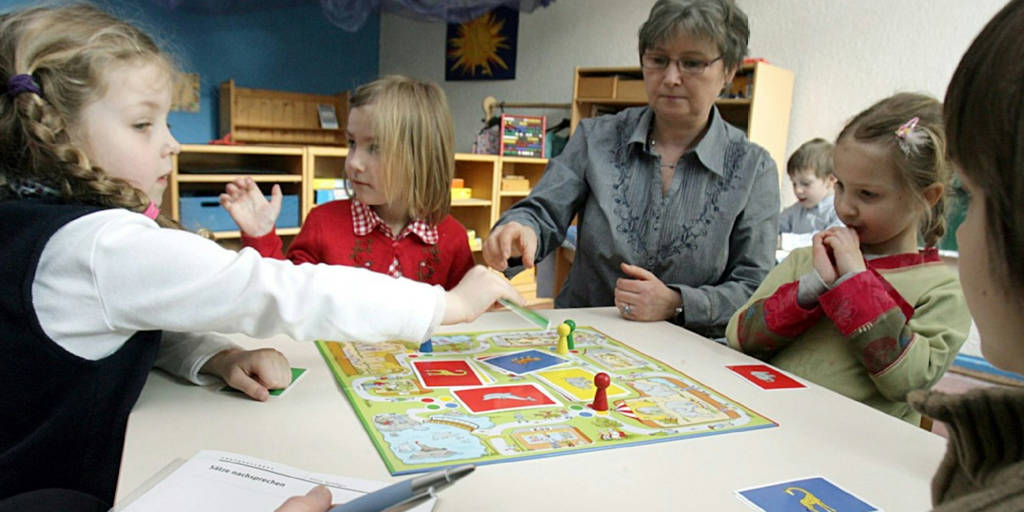 Test-Begleiterin Gabriele Werner spielt mit vier- und fünfjährigen Kindergartenkindern den Sprachtest Delfin.