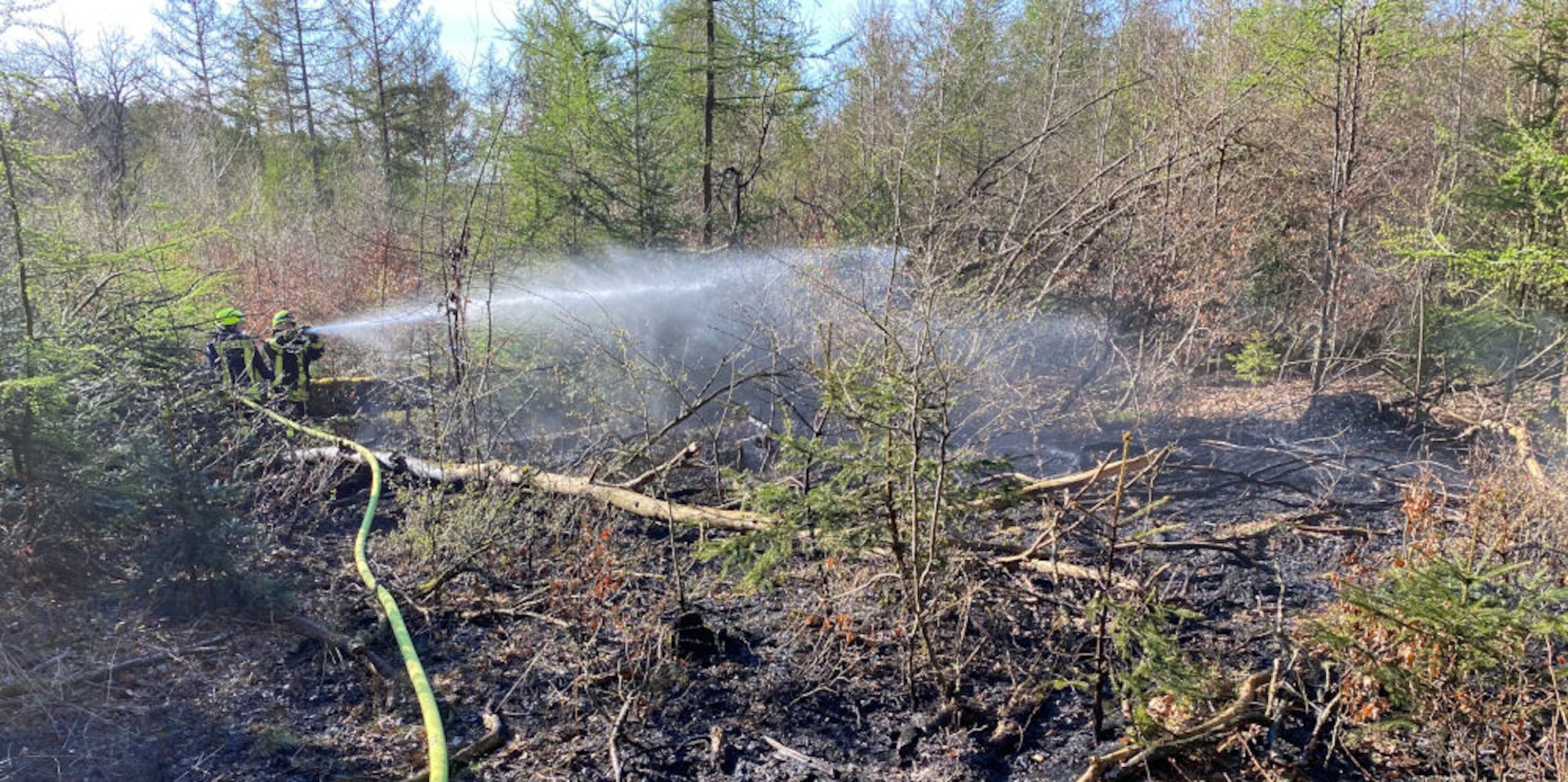 Rund 300 Meter von der Straße entfernt brannten rund 100 Quadratmeter Unterholz im Wald. Noch bevor der Brand gelöscht war, erhielt die Feuerwehr einen Hinweis auf einen weiteren Waldbrand in der Nähe. Die Löschgruppe Dohrgaul wurde alarmiert, dieses Mal brannten rund 20 Quadratmeter Gebüsch.